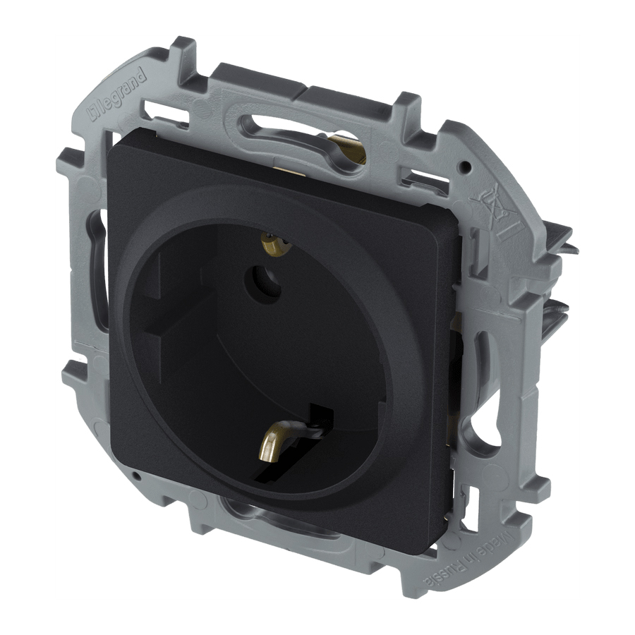 Розетка с заземлением и интегрированными защитными шторками Legrand Inspiria для скрытого монтажа. Максимальный ток 16 А, напряжение ~250В, максимальная мощность 3680 Вт.