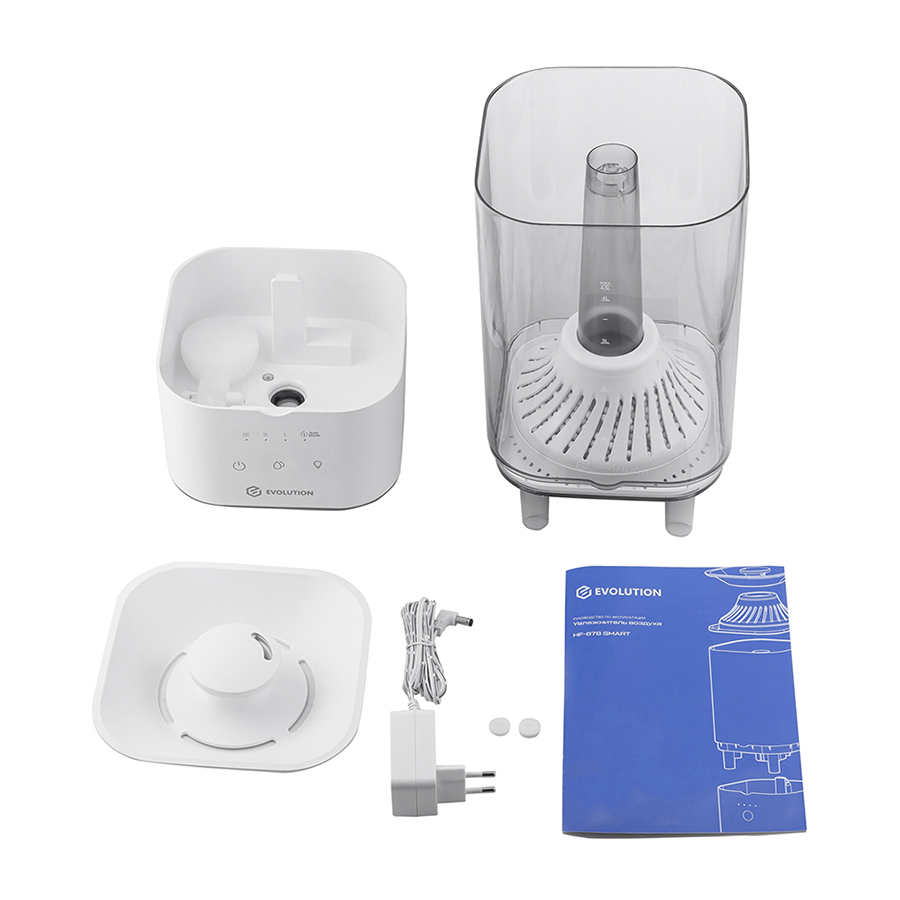 Оптимальная влажность, при которой вам будет комфортно — 40-70%. Такой уровень поможет поддерживать ультразвуковой увлажнитель воздуха Evolution HF-878 SMART. Прибор компактный и удобный в использовании. Его высота 35 см, а вес — 2 кг. Его можно устанавливать как на полу, так и на любых других поверхностях.