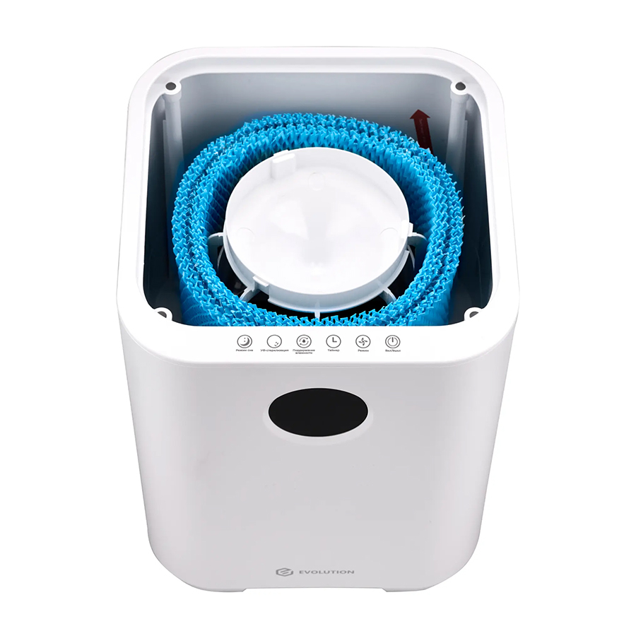 Увлажнитель воздуха для дома Evolution SmartAir Evaporative Pure HF-577 Smart основан на принципе естественного испарения. Его конструкция оснащена встроенным вентилятором, который при работе устройства забирает сухой воздух и пропускает его через влажный фильтр, что ускоряет процесс насыщения воздуха влагой и способствует повышению уровня влажности в помещении. Фильтр задерживает мелкую пыль, известь и другие вещества из воздуха и воды, тем самым очищая их и распыляя увлажненный воздух. Ультрафиолетовая лампа стерилизуют воду, уничтожая бактерии и вирусы. Благодаря этому вода не «цветет» и не источает неприятный запах. Функция ионизации создает отрицательные ионы, которые заставляют плавающие в воздухе частицы (пыль, шерсть домашних животных, аллергены) слипаться и падать на пол.