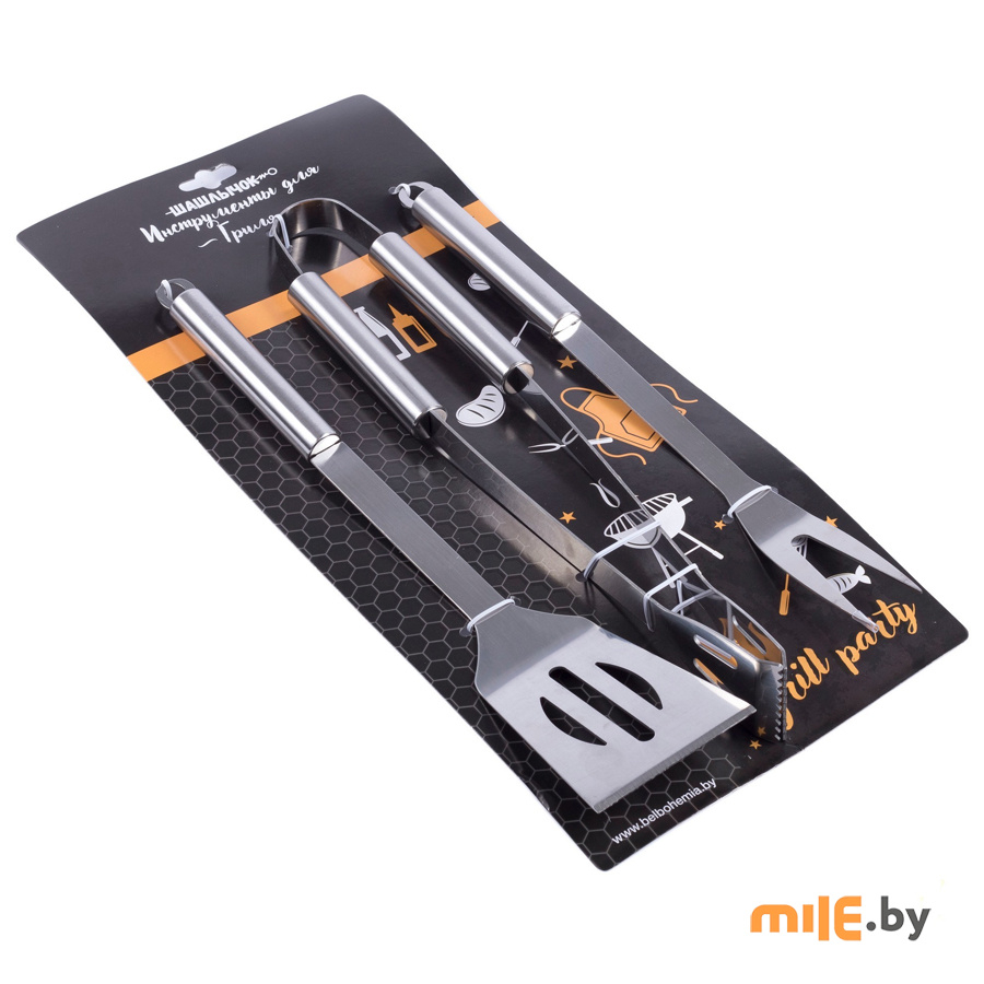 Набор инструментов для гриля металлических 3 предмета 37 см: вилка, лопатка, щипцы. Используется для приготовления мяса на углях (гриля). Перед первым использованием тщательно вымыть водой с моющим средством. Срок службы – не ограничен.