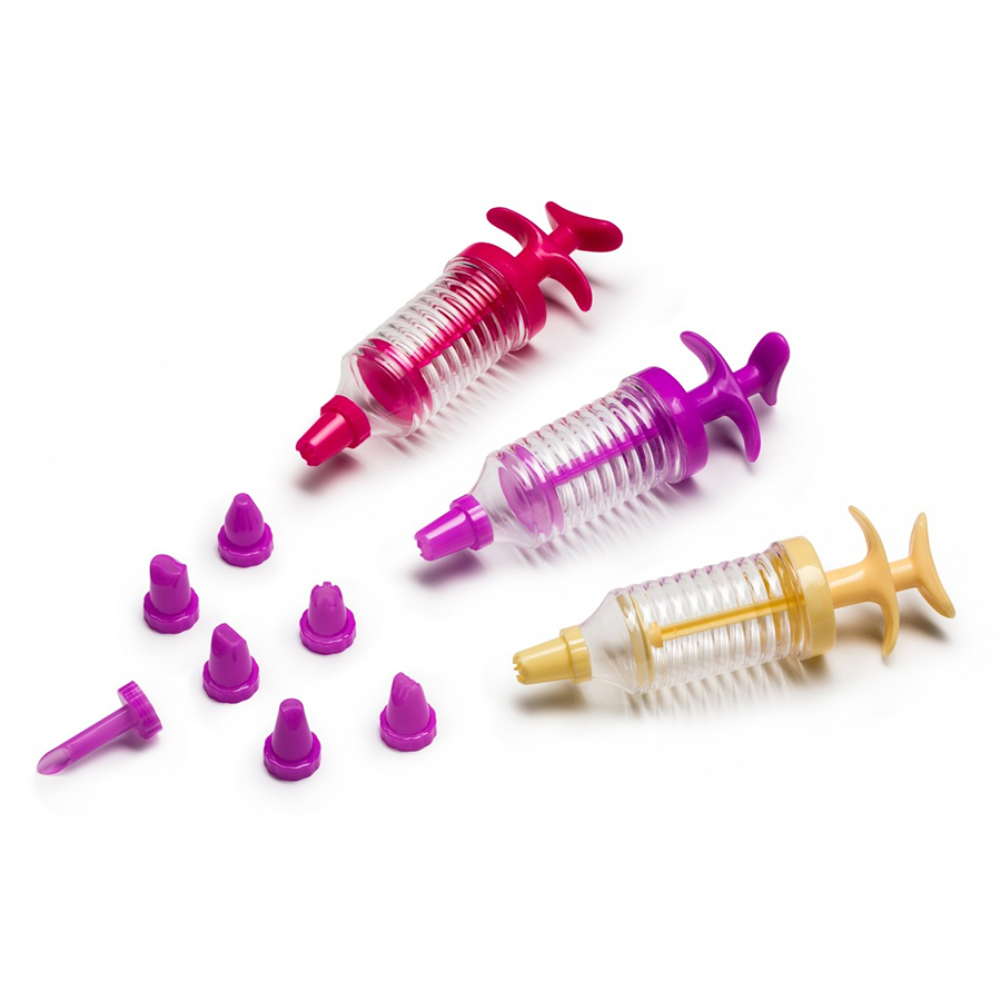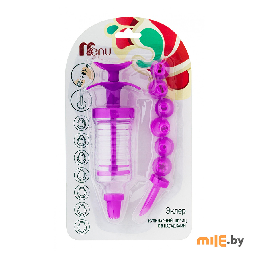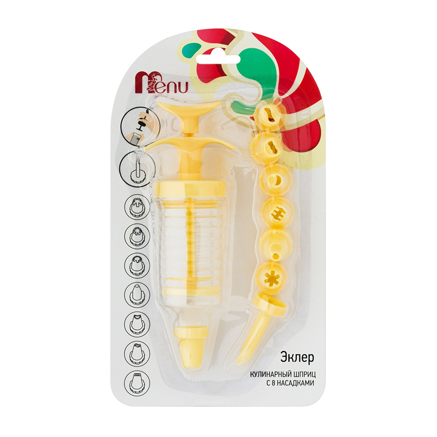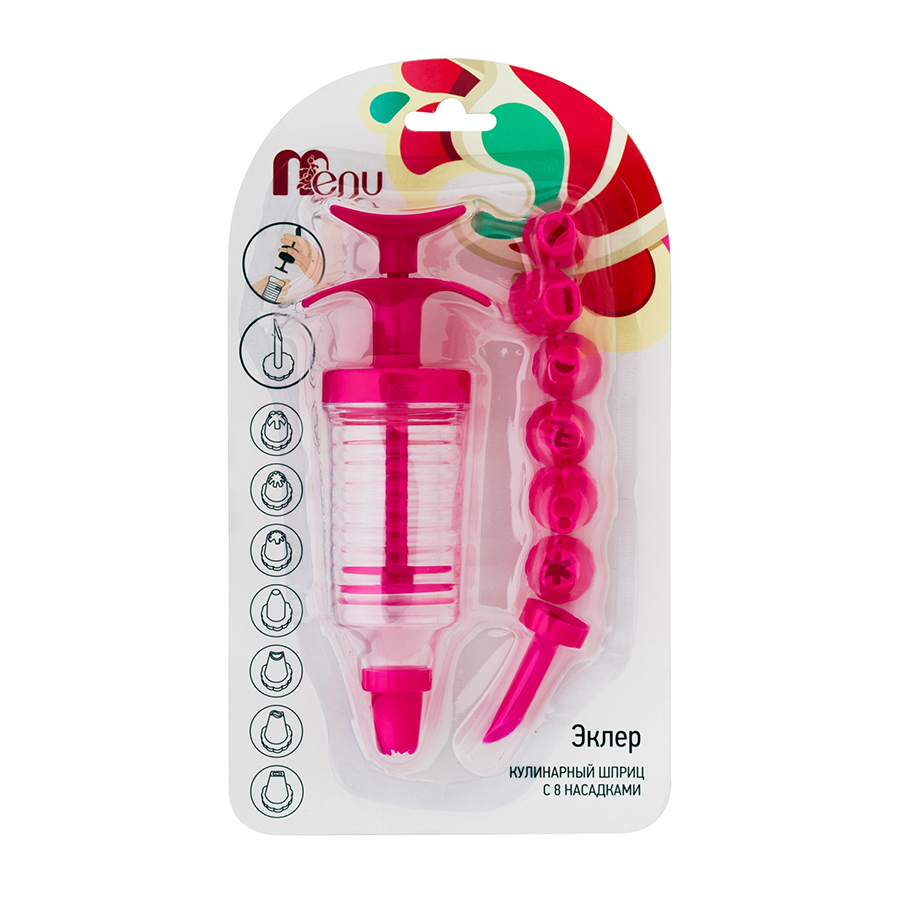 Кулинарный шприц имеет восемь сменных насадок разного сечения. Предназначено для домашнего использования. Мыть только вручную. Материалы изделия: пластик PP, пластик PS. Объем 100 мл.