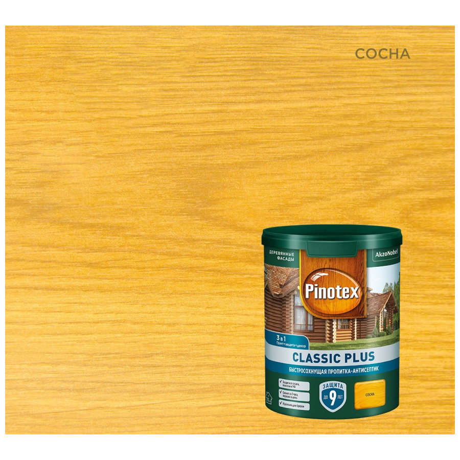 Быстросохнущая пропитка-антисептик 3в1 PINOTEX CLASSIC PLUS (сосна; 0.9 л) 5727794 обеспечивает равномерное впитывание в древесину. Защищает от плесени и образует декоративное финишное покрытие. Гибридное акрил-алкидное связующее образует атмосферостойкое паропроницаемое покрытие - древесина продолжает «дышать». Эластичное тонкое покрытие идеально подходит для обработки бревенчатых фасадов и бань. Вода в качестве растворителя, поэтому пропитка-антисептик имеет нейтральный запах, легко наносится и быстро сохнет. Полуматовое покрытие сохраняет видимой текстуру древесины. Чем более насыщенный цвет пропитки, тем более выражены защитные свойства.