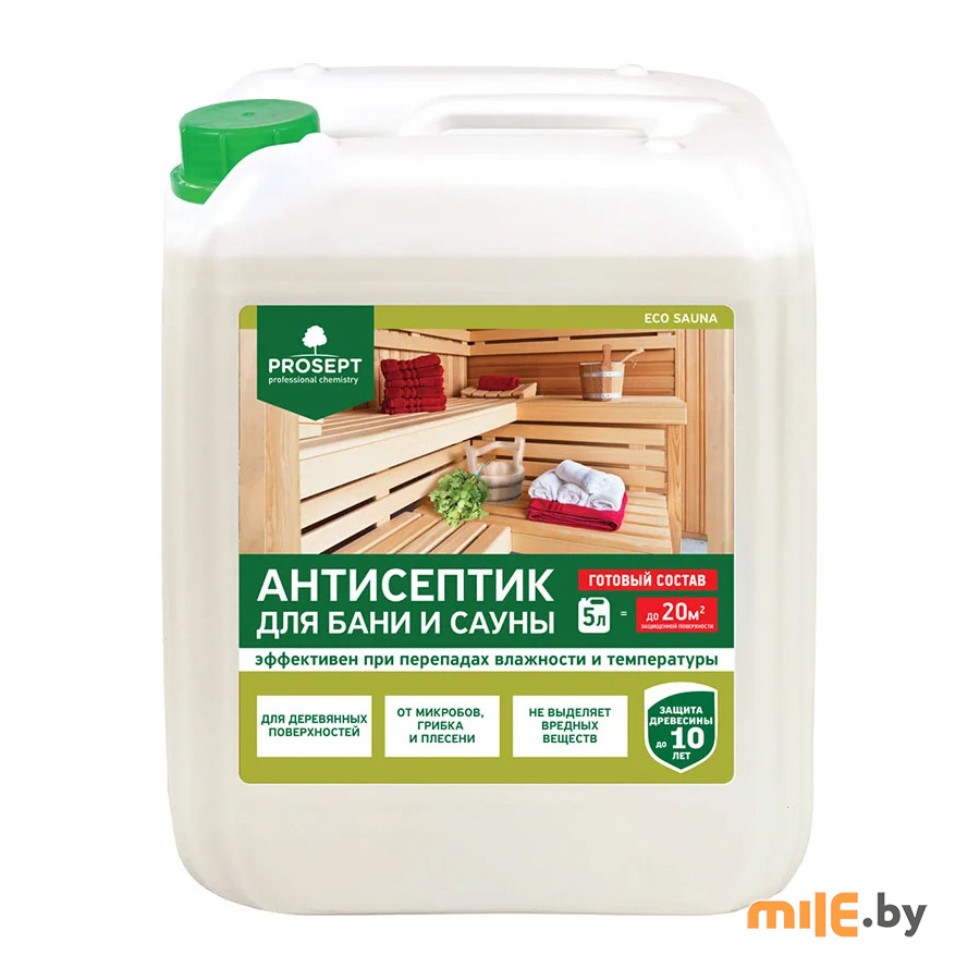 PROSEPT ECO SAUNA – антисептик на водной основе для бань и саун. Предназначен для защиты древесины от действия дереворазрушающих и деревоокрашивающих плесневых грибов в саунах, парных, моечных и прилегающих к ним помещениях. Содержит компонент, предотвращающий развитие болезнетворных микробов, спор грибков. Обеспечивает надежную защиту при циклическом увлажнении и перепадах температур.