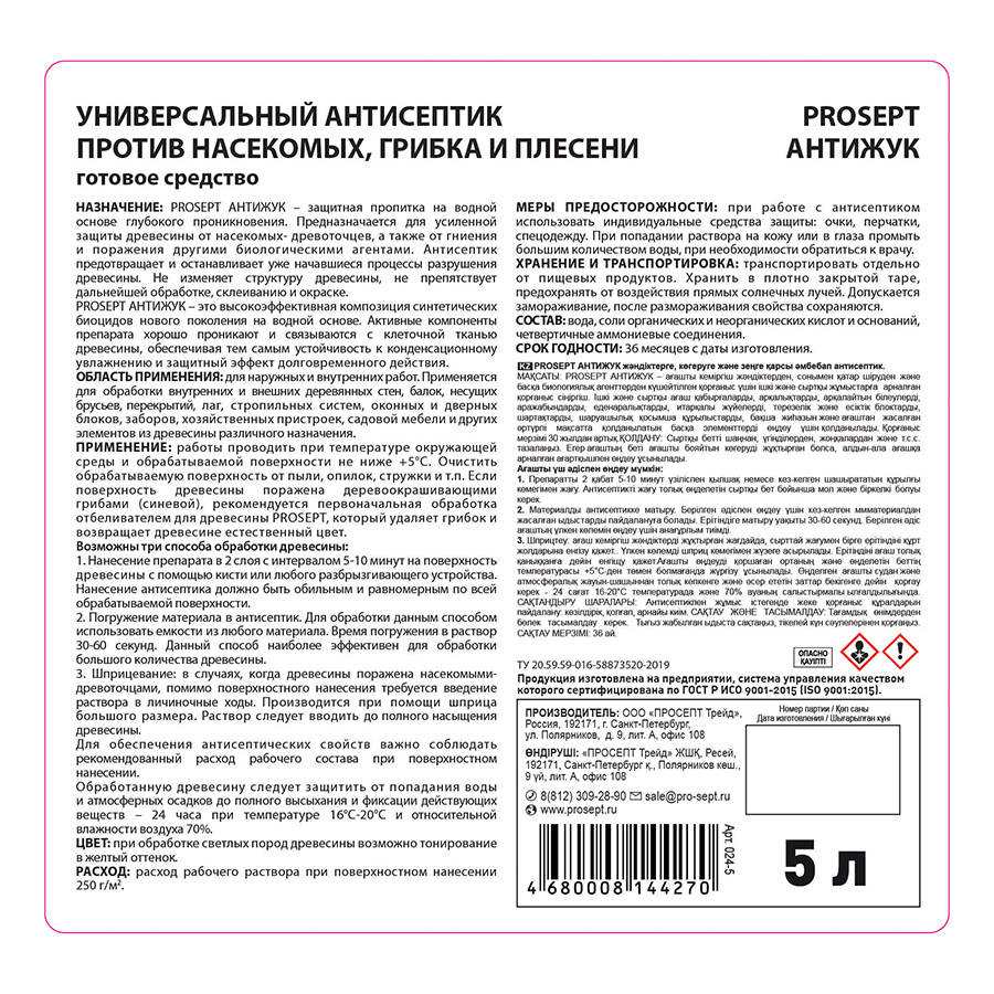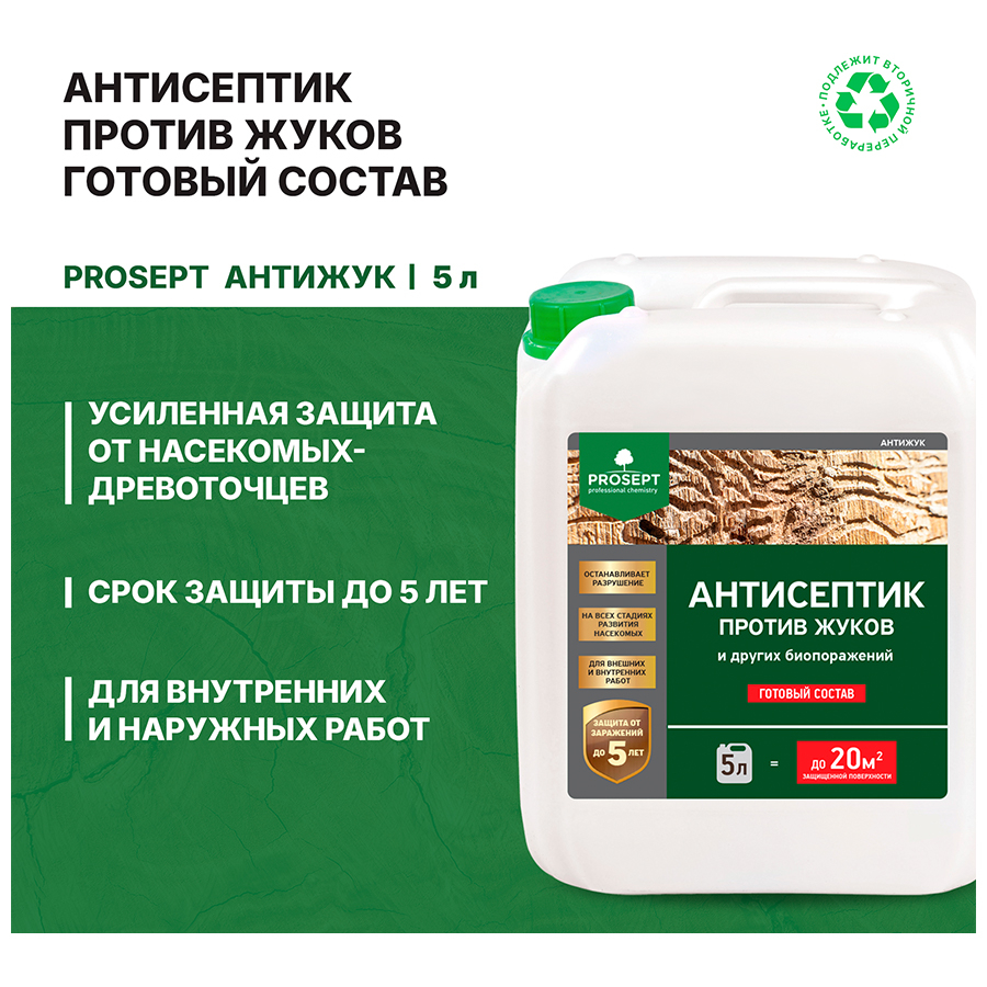 PROSEPT АНТИЖУК – защитная пропитка на водной основе глубокого проникновения. Предназначается для усиленной защиты древесины от насекомых-древоточцев, а также от гниения и поражения другими биологическими агентами. Для наружных и внутренних работ. Применяется для обработки внутренних и внешних деревянных стен, балок, несущих брусьев, перекрытий, лаг, стропильных систем, оконных и дверных блоков, заборов, хозяйственных пристроек, садовой мебели и других элементов из древесины различного назначения. Антисептик предотвращает и останавливает уже начавшиеся процессы разрушения древесины биологическими агентами. Особенность - не изменяет цвет и структуру древесины; не препятствует дальнейшей обработке, склеиванию и окраске. Соответствует новым Европейским стандартам обработки строительной древесины для Классов Использования 1, 2 и 3A.