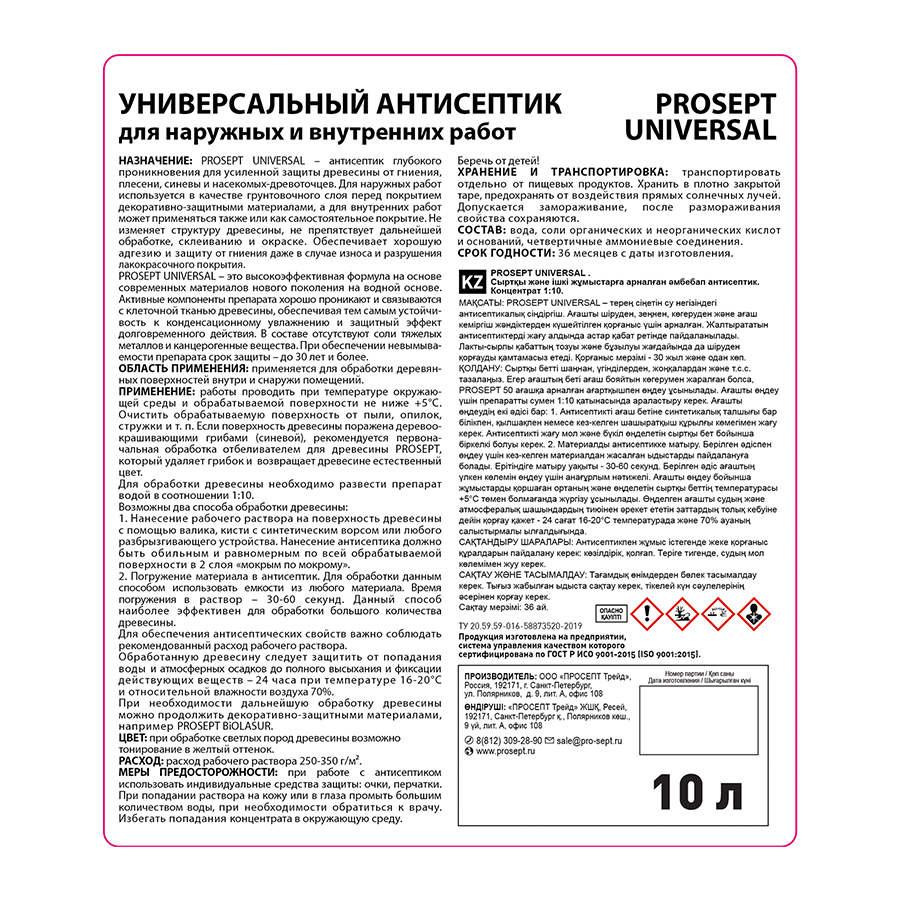 Prosept Eco Universal (015-10) – готовый состав антисептической пропитки глубокого проникновения на водной основе. Предназначается для усиленной защиты древесины от гниения, плесени, синевы и насекомых-древоточцев. Используется как самостоятельное покрытие или в качестве грунтовочного слоя перед покрытием лессирующим антисептиком. Улучшает адгезию. Обеспечивает защиту от гниения даже в случае износа и разрушения лакокрасочного покрытия.