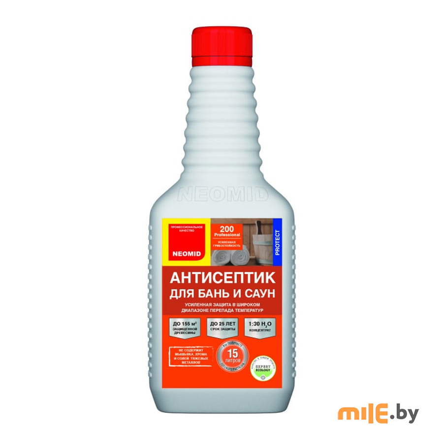 Neomid 200 – антисептическая пропитка для защиты древесины внутри бань и саун, включая полки и скамейки, в условиях частого перепада температур и повышенной влажности.