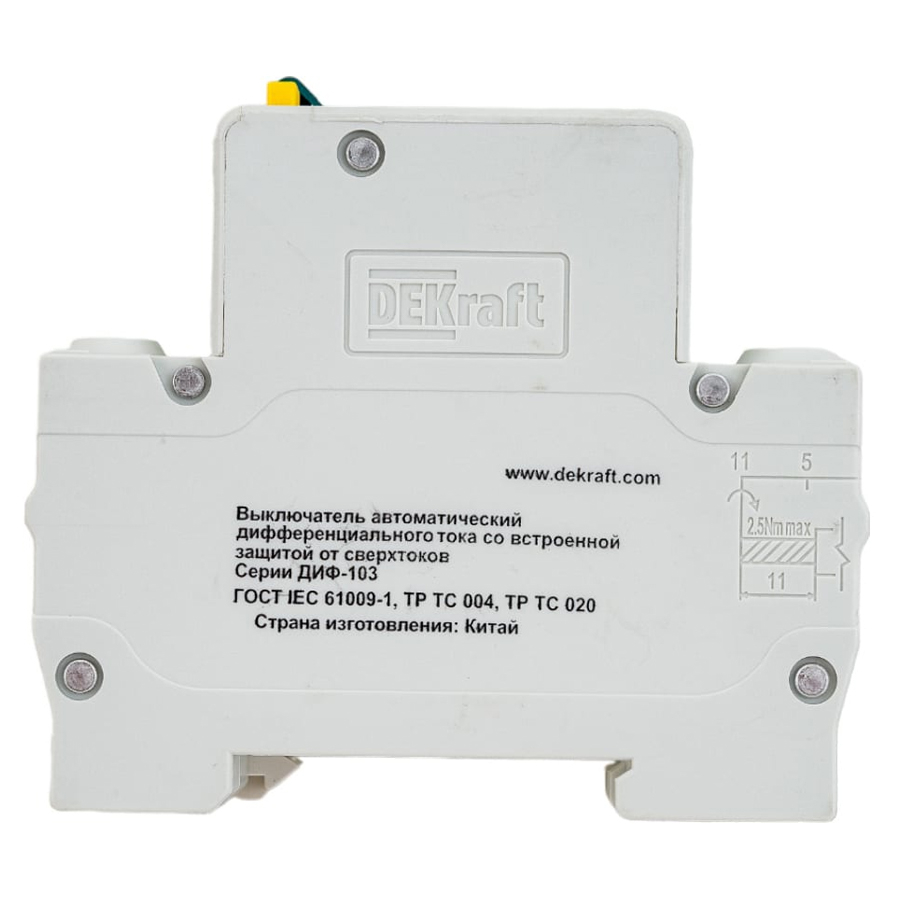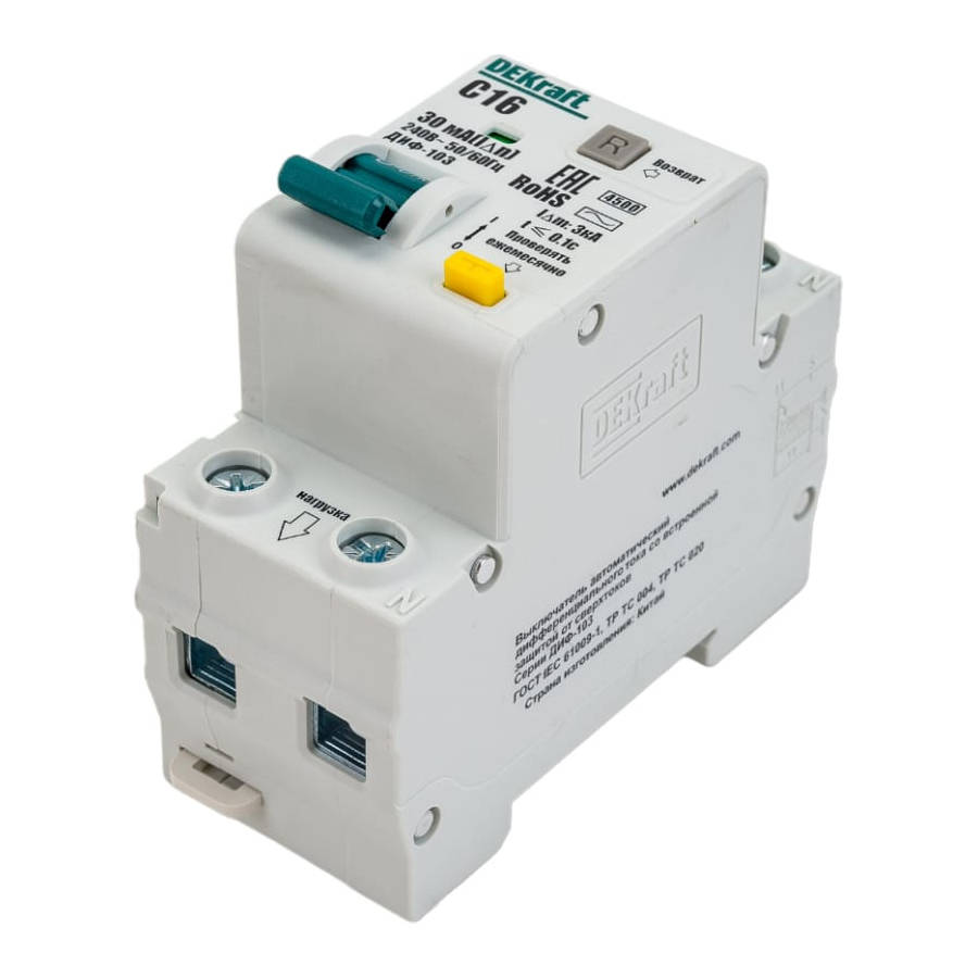 Автоматический выключатель дифференциального тока DEKraft 1Р+N 16А 30мА тип AC х-ка C ДИФ-103 4,5кА 16052DEK