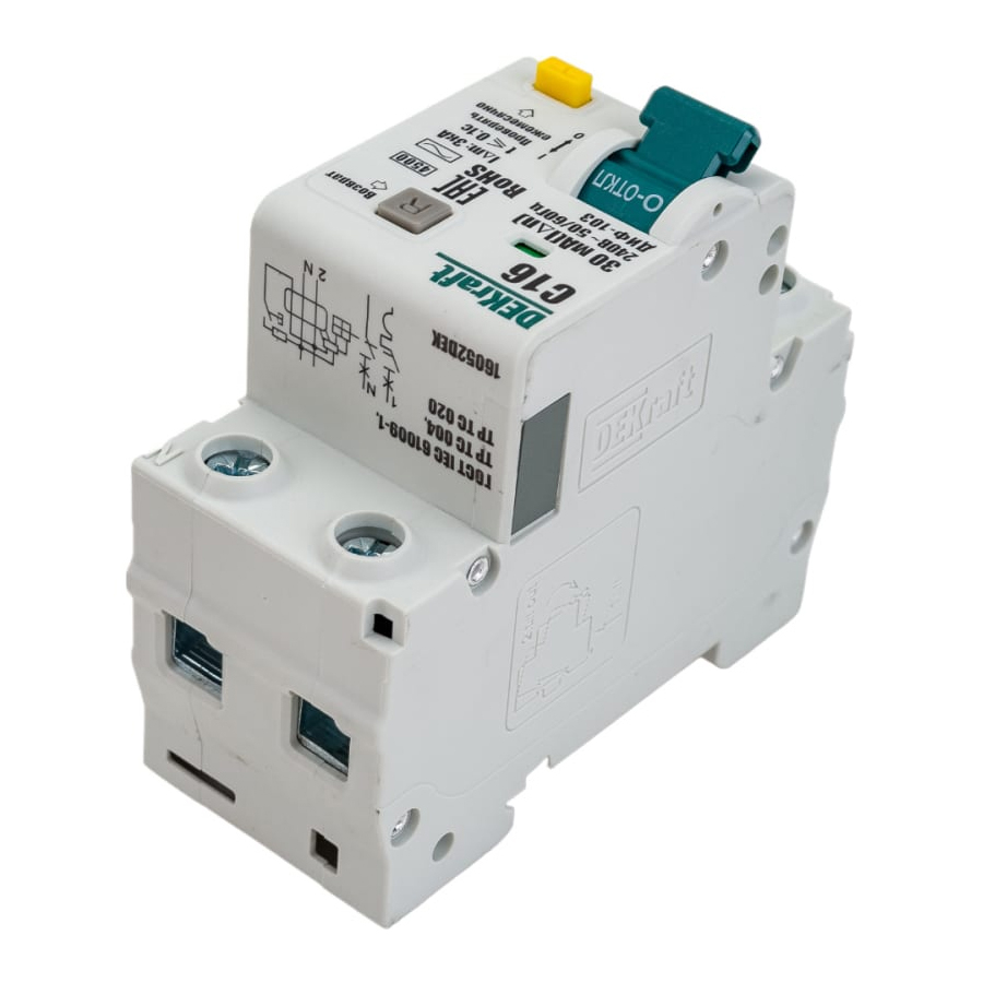 Автоматический выключатель дифференциального тока DEKraft 1Р+N 16А 30мА тип AC х-ка C ДИФ-103 4.5кА 16052DEK сочетает функции автоматического выключателя и УЗО (ВДТ). Модель обеспечивает три вида защиты - от короткого замыкания, перегрузки и возникновения утечки тока (в частности, вследствие прикосновения человека к токоведущим частям). Конструктивно представляют собой автоматический выключатель с присоединенным к нему электронным блоком дифференциальной защиты.