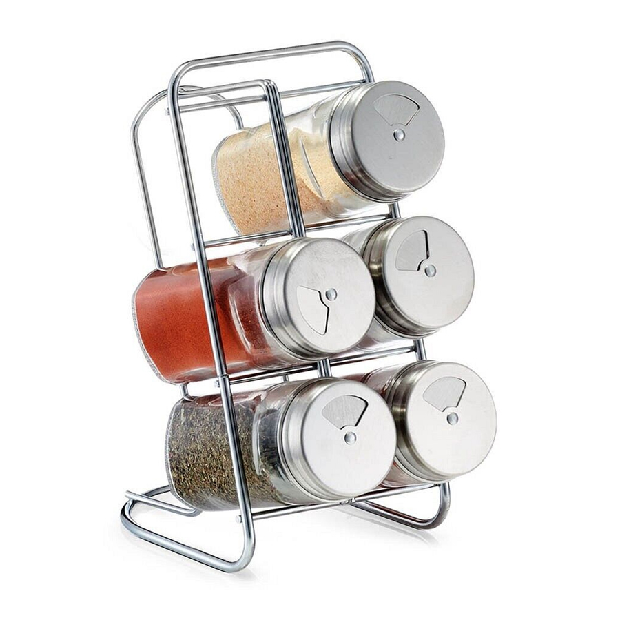 Набор для специй состоит из 6 баночек и стальной подставки, которая облегчает разделение баночек и позволяет хранить их в организованном порядке.