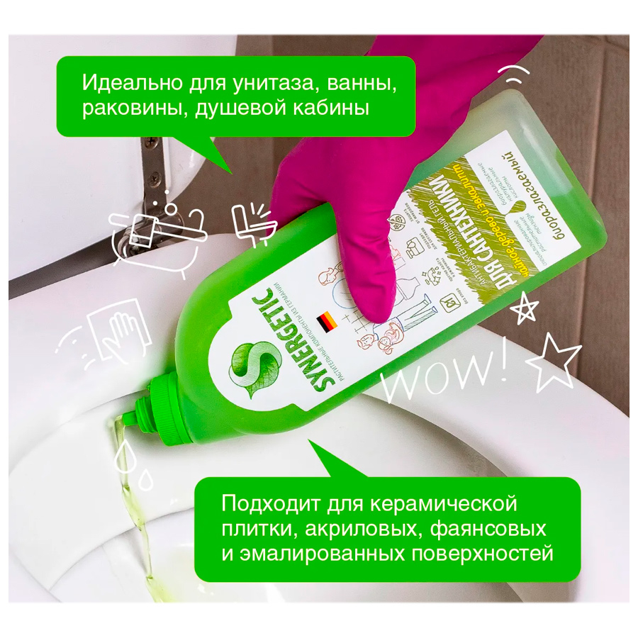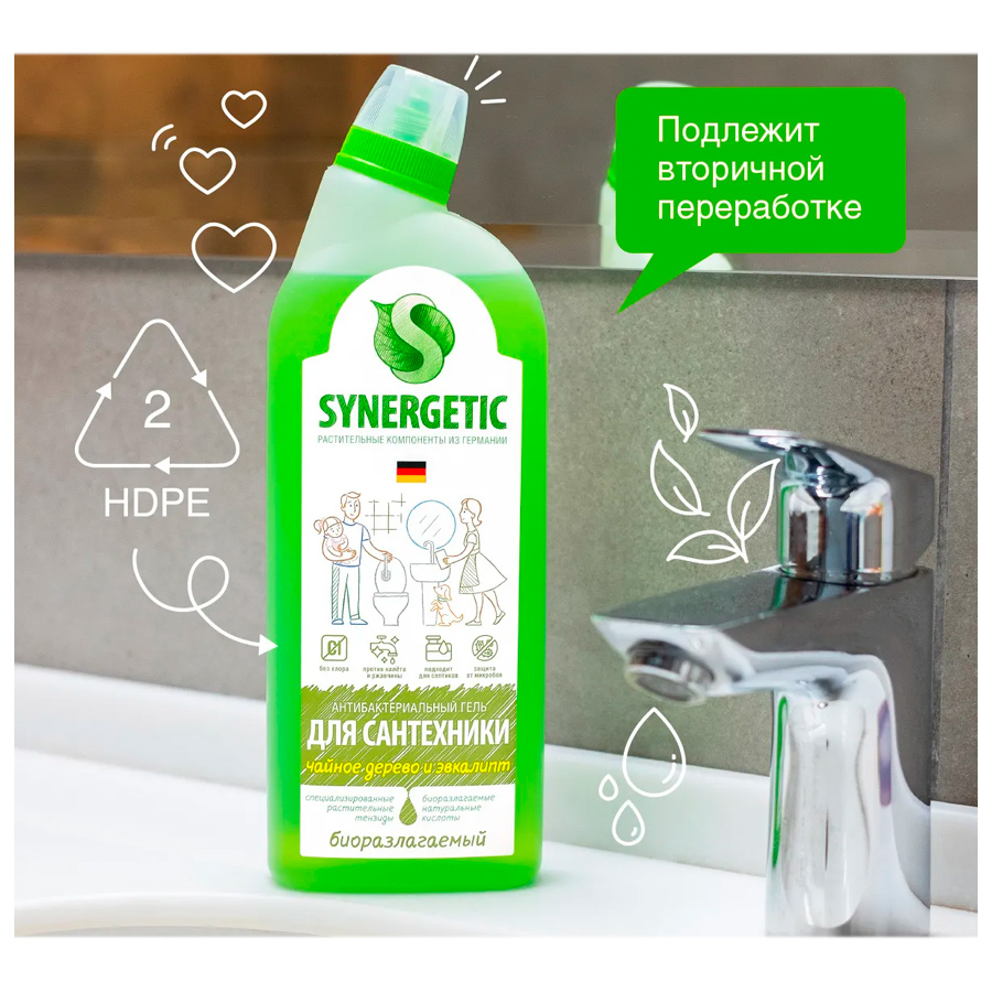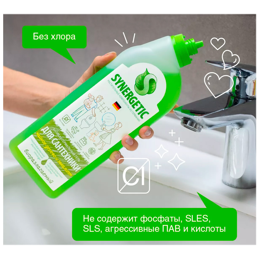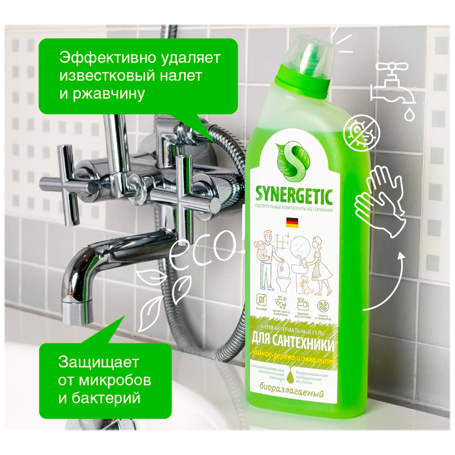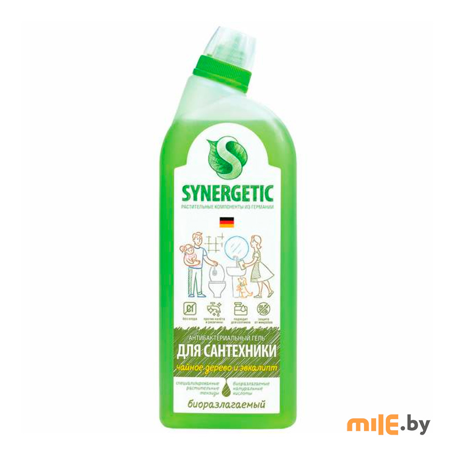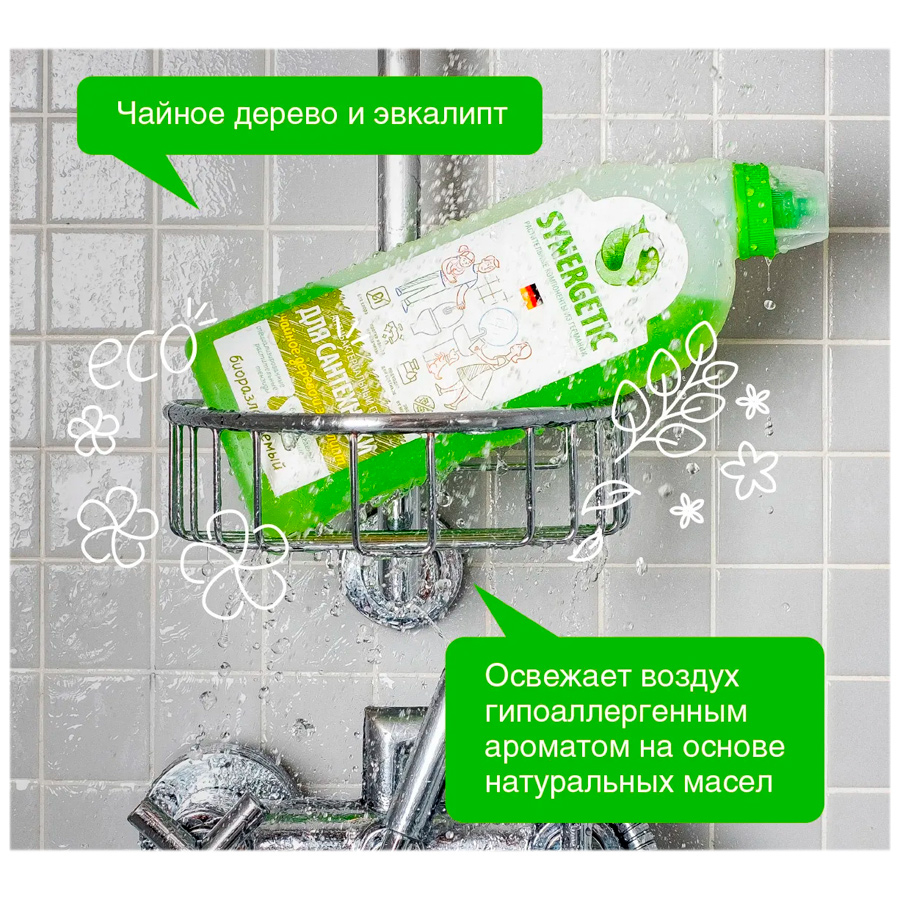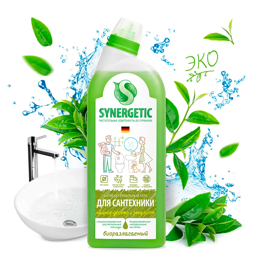 Концентрированное биоразлагаемое средство для мытья сантехники SYNERGETIC «Чайное дерево и эвкалипт» – универсальное кислотное средство, подходящее для ежедневной уборки всех видов поверхностей, устойчивых к кислотным моющим средствам, в ванных комнатах и санузлах. Комплекс натуральных кислот (лимонной, гликолевой и молочной) и Н-тензидов, полученных из растительных масел, устраняет известковый налет, ржавчину, камень и минеральные загрязнения даже в холодной и жесткой воде. Средство с антибактериальным эффектом убивает микробы и бактерии, а также эффективно устраняет неприятные запахи. Смывается на 100% и не остается на поверхностях. Гипоаллергенная отдушка на основе эфирных масел мяты, шалфея, чайного дерева, эвкалипта придает средству и очищенным поверхностям приятный свежий аромат. Средство безопасно для септических установок. Попадая в среду септика, средство для мытья поверхностей «понятно» для микроорганизмов и без труда распадается на простые соединения.