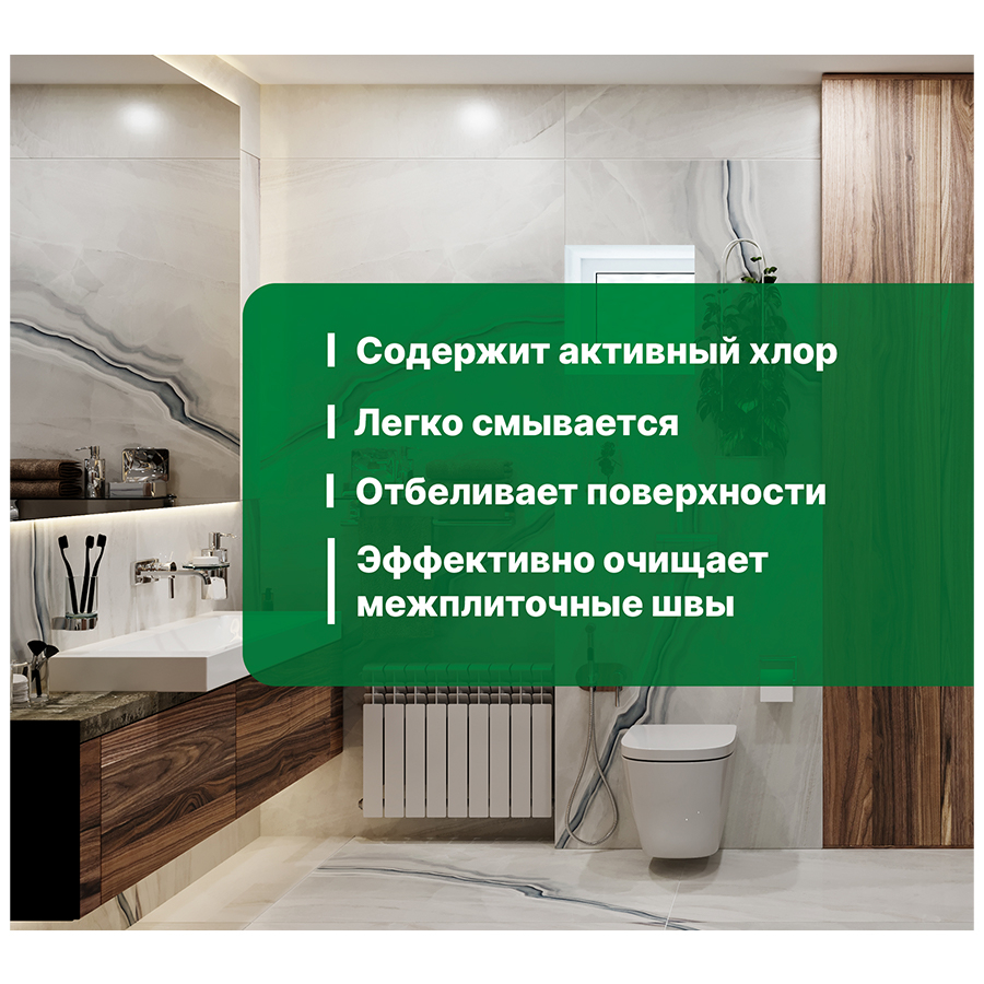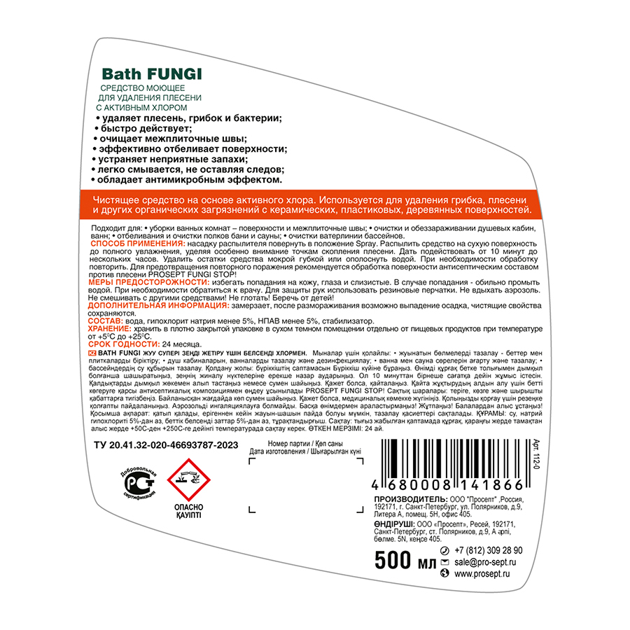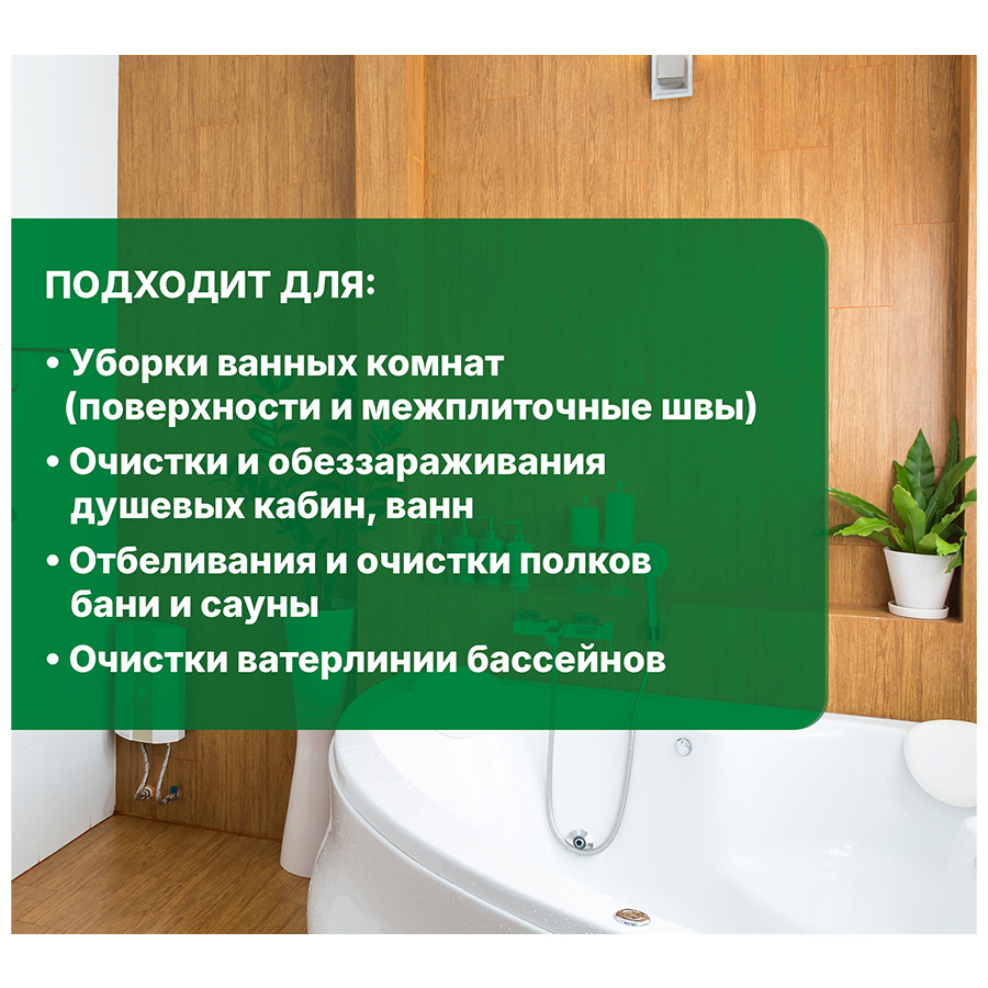 Средство для удаления плесени с дезинфецирующим эффектом Prosept Bath fungi — чистящее средство на основе активного хлора для удаления плесени. Удаляет плесень, грибок и бактерии. Быстро действует. Очищает межплиточные швы. Эффективно отбеливает поверхности. Устраняет неприятные запахи. Легко смывается, не оставляя следов. Обладает антимикробным эффектом. Используется для удаления грибка, плесени и других органических загрязнений с керамических, пластиковых, деревянных поверхностей. Подходит для: уборки ванных комнатах (поверхности и межплиточные швы), очистки и обеззараживания душевых кабин, ванн, отбеливания и очистки полков в бане и сауне, очистки ватерлинии бассейнов. ВНИМАНИЕ! С осторожностью использовать на хромированных поверхностях. Не использовать на мраморе. Значение pH (концентрат): 12,0.