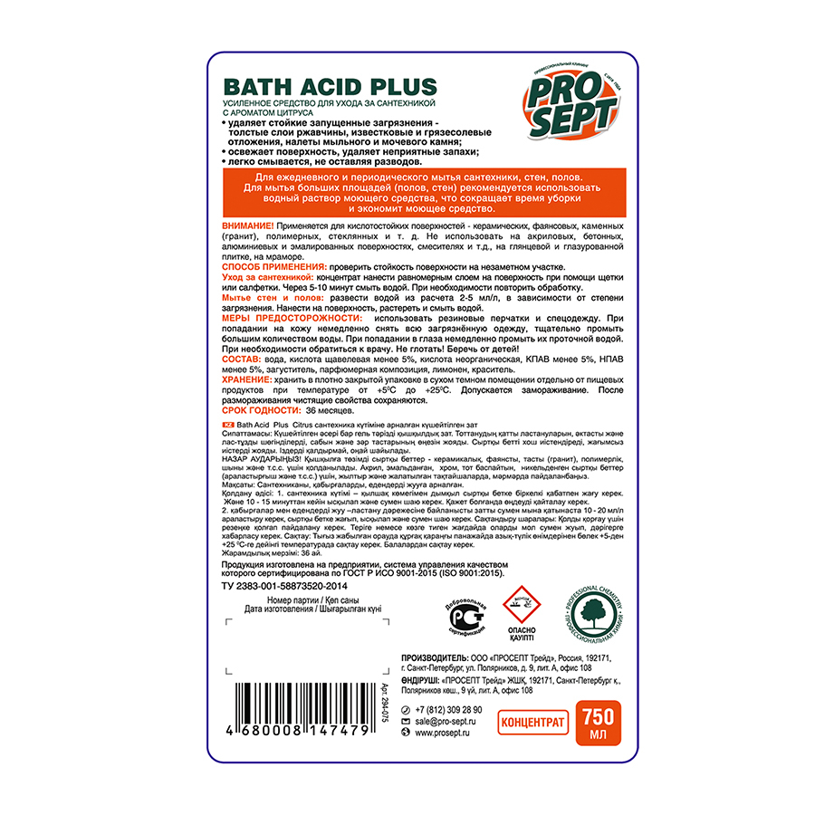 Средство усиленного действия для удаления ржавчины и минеральных отложений Bath Acid + с аромат цитруса (294-075) 0,75 л