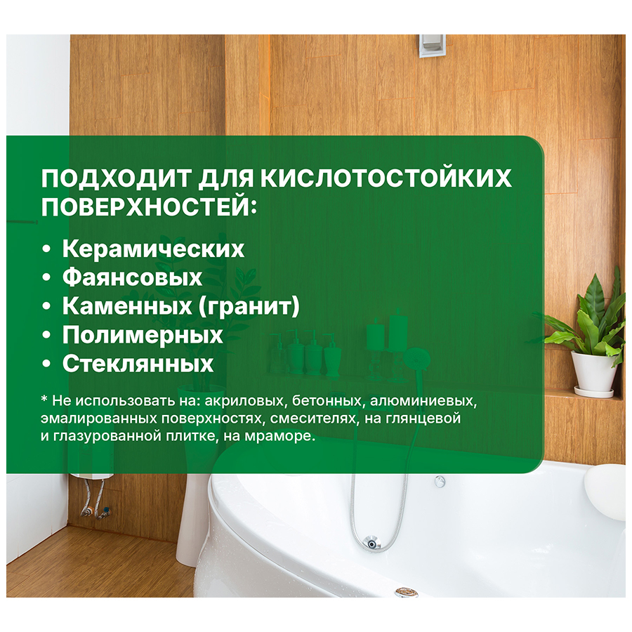 ВНИМАНИЕ! Не использовать на акриловых, бетонных, алюминиевых и эмалированных поверхностях, смесителях и т. д., на глянцевой и глазурованной плитке, на мраморе.