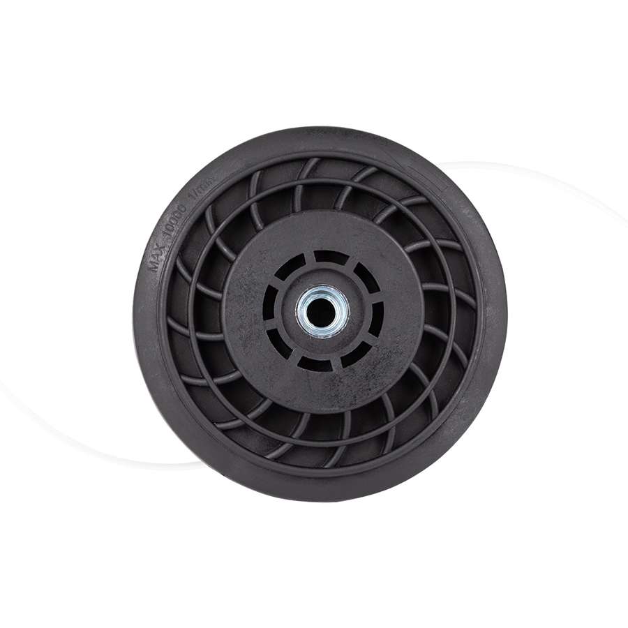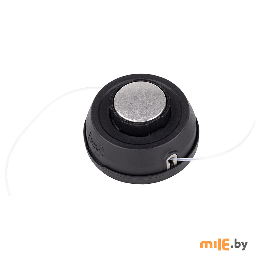 Заправка лески осуществляется без снятия крышки с катушки, достаточно вставить в отверстия катушки леску и намотать ее с помощью кнопки-фиксатора. Металлическая кнопка подачи лески предохраняет катушку от износа. Леска подается полуавтоматически — достаточно слегка ударить катушку о землю.