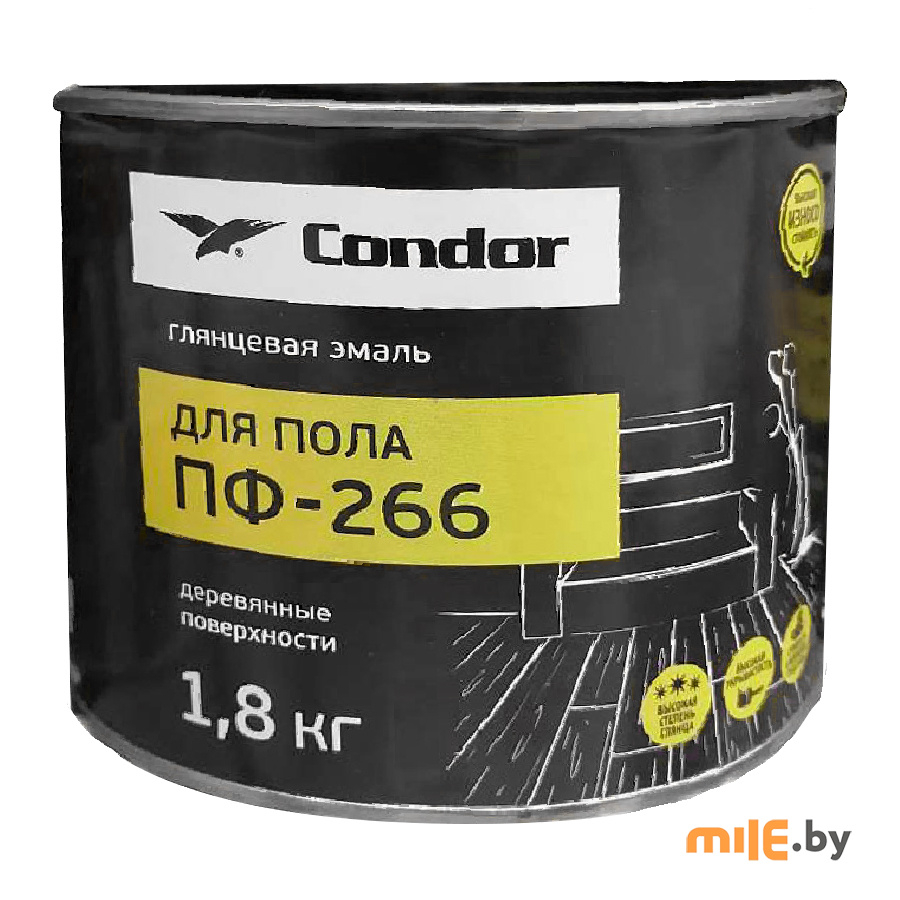 Эмаль ПФ-266 используют для покраски новых и ранее окрашенных полов из древесины, ДВП, ДСП, а также других деревянных поверхностей (в том числе порогов, плинтусов, лестниц и т.д.) в жилых, бытовых, административных и производственных помещениях с нормальными эксплуатационными требованиями. Окрашиваемая поверхность должна быть обезжиренной, сухой и очищенной от отслаивающейся краски, грязи и пыли. Бетонные полы предварительно рекомендуется прогрунтовать грунтовкой Condor ГФ-021.