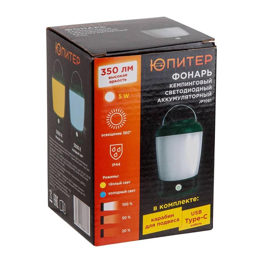 Фонарь светодиодный кемпинговый 5 Вт ЮПИТЕР (JP1061) - отличный помощник на отдыхе в походе, на работе в гараже или любых других ситуациях. Отличается практичным корпусом, с возможностью установить на ровную поверхность или подвесить; современный разъем USB Type-C (кабель для зарядки в комплекте) поможет зарядить фонарь в любом месте при наличии USB-зарядки, подключение к Power Bank может продлить время работы; встроенный Li-ion аккумулятор заряжается гораздо быстрее классических аккумуляторов; 2 вида освещения с теплым 3000К или холодным 5000К светом помогут создать уютную обстановку на природе, в палатке или любом другом месте.