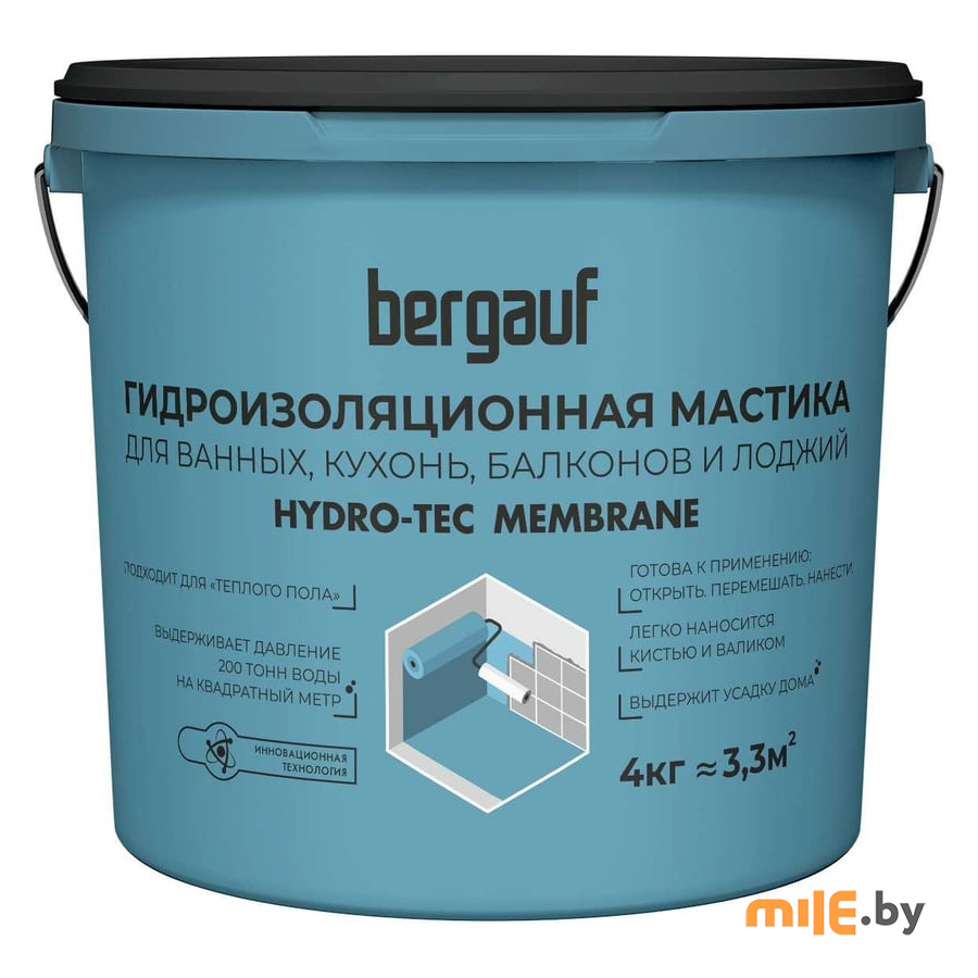 Материал наносят на основание за два прохода кистью, валиком или шпателем в перекрестных направлениях слоем общей толщиной 1-1,5мм. Время высыхания после нанесения первого слоя составляет 2 часа, после второго слоя не более 6 часов (при нормальных условиях – температуре окружающей среды +20°C и относительной влажности воздуха 60%). Стыки вертикальных и горизонтальных поверхностей следует дополнительно изолировать гидроизоляционной лентой Bergauf Hydrolenta, приклеив ее с помощью Bergauf Hydro-TEC Membrane.