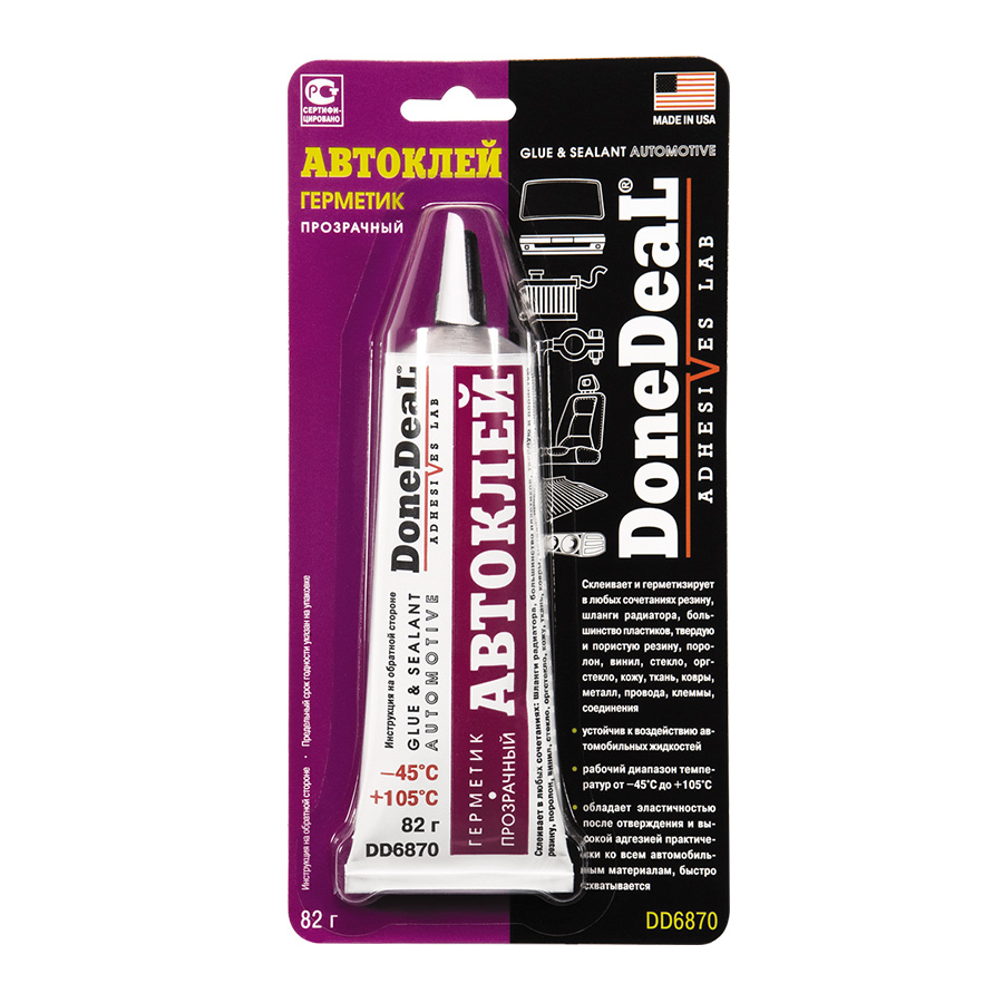 Клей - герметик DD6870 -универсальный, вязкий, прозрачный клей-герметик для склеивания практически всех материалов, применяемых в автомобиле. Позволяет надежно соединить разнородные материалы с различным коэффициентом теплового расширения. Универсальный клей-герметик, предназначенный для склеивания и герметизации в любых сочетаниях различных материалов (кожа, ткань, резина, стекло и многое другое).
