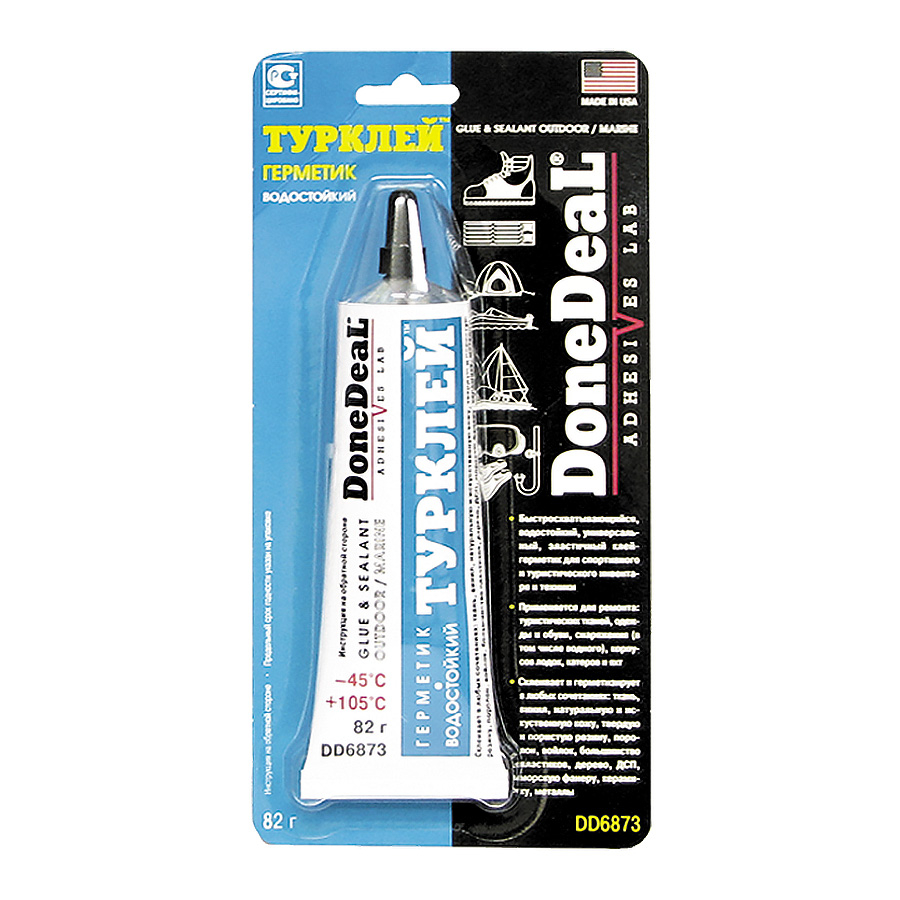 Клей - герметик DD6873 - универсальный, вязкий, прозрачный клей-герметик для склейки практически всех материалов, применяемых при производстве спортинвентаря, туристического снаряжения, обуви, одежды, надувных матрасов, лодок, катеров, яхт. Позволяет осуществить восстановление конструкций из разнородных или композиционных материалов, не поддающихся ремонту обычными клеями или герметиками, так как обычные клеи не обеспечивают достаточную вязкость и эластичность клеевого шва, а эластичные герметики не обладают достаточной прочностью соединения. Преимущества: легко проникает в структуру прорезиненной ткани, образуя прочный, эластичный, влагонепроницаемый ремонтный слой; выдерживает перепады температуры; выдерживает ударные нагрузки и вибрации; устойчив к воздействию технических жидкостей, слабых кислот и щелочей; после полной полимеризации могут окрашиваться лаками и эмалями.