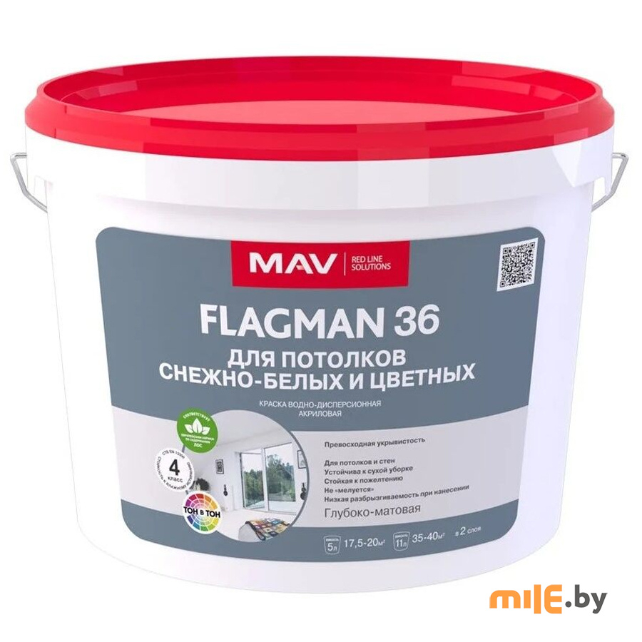 Краска FLAGMAN 36 MAV белая для потолков (Беларусь) благодаря усовершенствованной рецептуре, краска соответствует европейским требованиям по минимальному содержанию летучих органических соединений (*ЛОС) согласно директиве 2004/42/ЕС, что подтверждает ее дополнительную экологическую безопасность для здоровья человека как при нанесении, так и во время последующей эксплуатации покрытия. В течение 20 – 40 мин после нанесения поверхность приобретает максимально белоснежный оттенок, который на протяжении всего срока службы остается неизменным. Краска не образует потёков, обладает высокой укрывистостью, низкой разбрызгиваемостью при нанесении, хорошей адгезией.