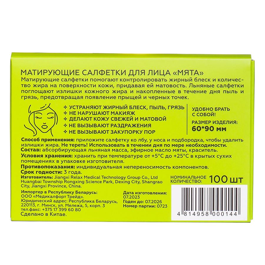 Матирующие салфетки из льняной бумаги с мятой – это быстрая свежесть и мгновенное матирование в течение дня. Они эффективно впитывают излишки себума и пота, устраняют жирный блеск и дарят коже ощущение чистоты. Экстракт мяты оказывает лёгкий охлаждающий эффект, помогая коже чувствовать себя комфортно даже в жаркую погоду. Эти сухие одноразовые салфетки без спирта подходят для ежедневного использования, не нарушают макияж и удобны в дороге. Их могут использовать девушки, женщины, подростки. Благодаря своей уникальной формуле, они не только безопасно и деликатно удаляют жирный блеск, но и ухаживают за кожей, не вызывая закупорку пор. Это особенно важно для тех, у кого проблемная кожа или склонная к появлению прыщей и черных точек.