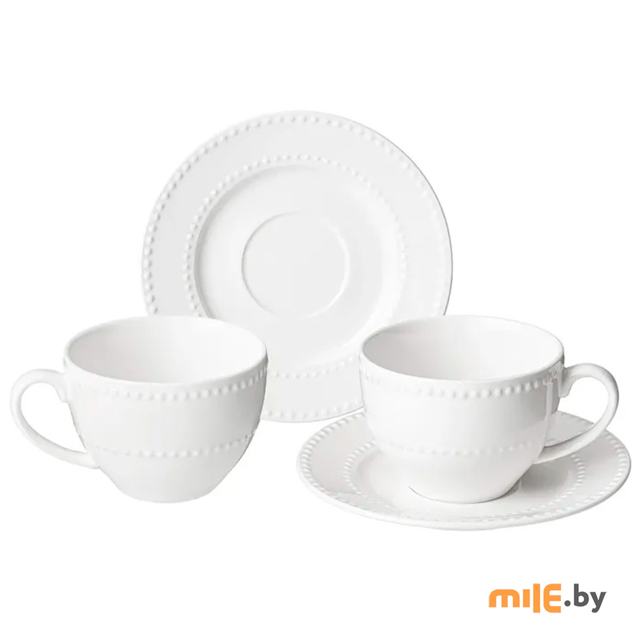 Дизайн набора соответствует трендам: белоснежный цвет и оригинальный рельеф по краю в виде горошин делают его универсальным дополнением к любой сервировке. Удобные формы и размеры обеспечивают комфортное использование.