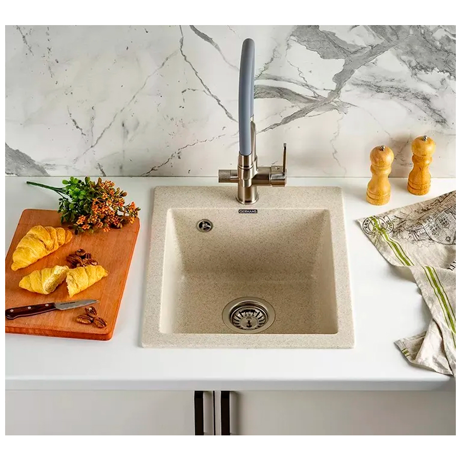 Каменная мойка для кухни Gerhans А10-20 из искусственного камня без крыла бежевая. Классическая прямоугольная мойка компактного размера позволяет установить ее в узкий кухонный модуль. Глубокая чаша вмещает большое количество комплектов посуды.