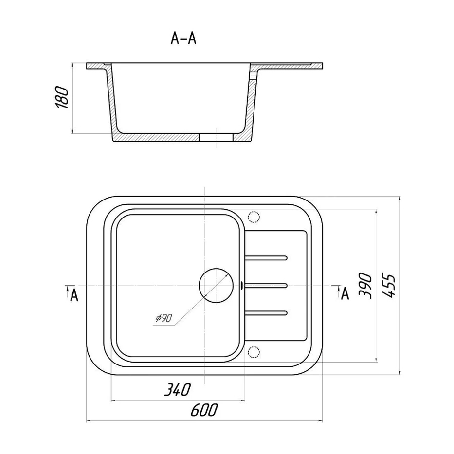 Размер мойки: 600х455х200 (± 5мм). Высота чаши: 180 мм. Размер чаши: 340х390 мм.