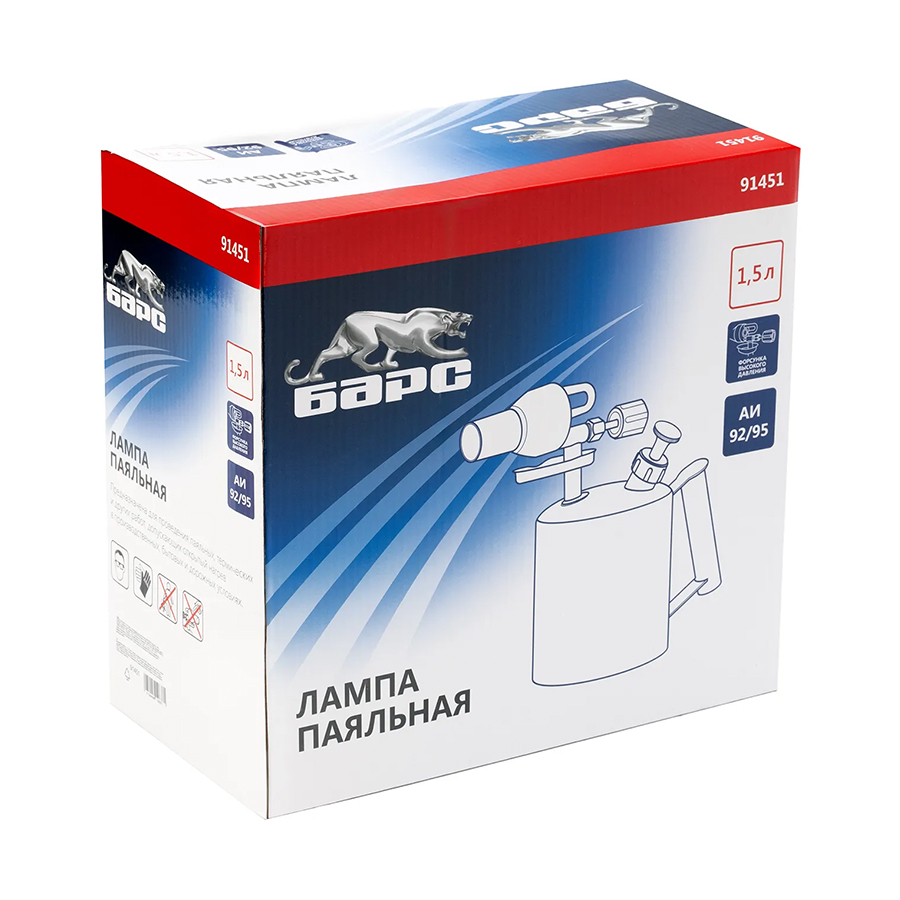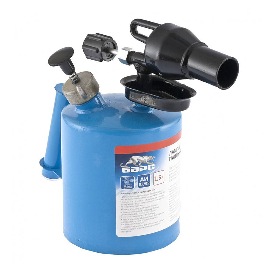 Паяльная лампа Барс (91451) с объемом бака 1,5 л предназначена для нагрева поверхностей при помощи открытого направленного пламени. Устройство используется при выполнении ремонтных и демонтажных работ — для пайки, термообработки деталей, установки термоусадочных трубок, снятия лакокрасочного покрытия. Также лампа будет полезна в сельском хозяйстве и в быту.