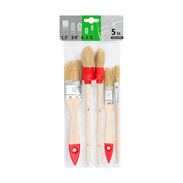 Набор кистей 5 шт. HARDY Малярные кисти — необходимый инструмент для ремонта. Применяются малярные (строительные) кисти для покраски или побелки любых поверхностей. Также можно использовать эти инструменты для нанесения грунта на какую-либо поверхность, пропитки поверхности олифой. Существует определенная классификация строительных малярных приспособлений.От типа краски будет зависеть и выбор материала щетины кисти: так для работы с алкидными или масляными красками подойдет щетина из натурального или синтетического материала. А вот эмали можно наносить только кистью из натурального материала. Латексные краски же любят искусственное волокно.В зависимости от типа выполняемых работы подбирают форму и размер кисти: для покраски значительных по площади поверхностей рационально использовать крупные кисти, а для миниатюрных работ — небольшие.