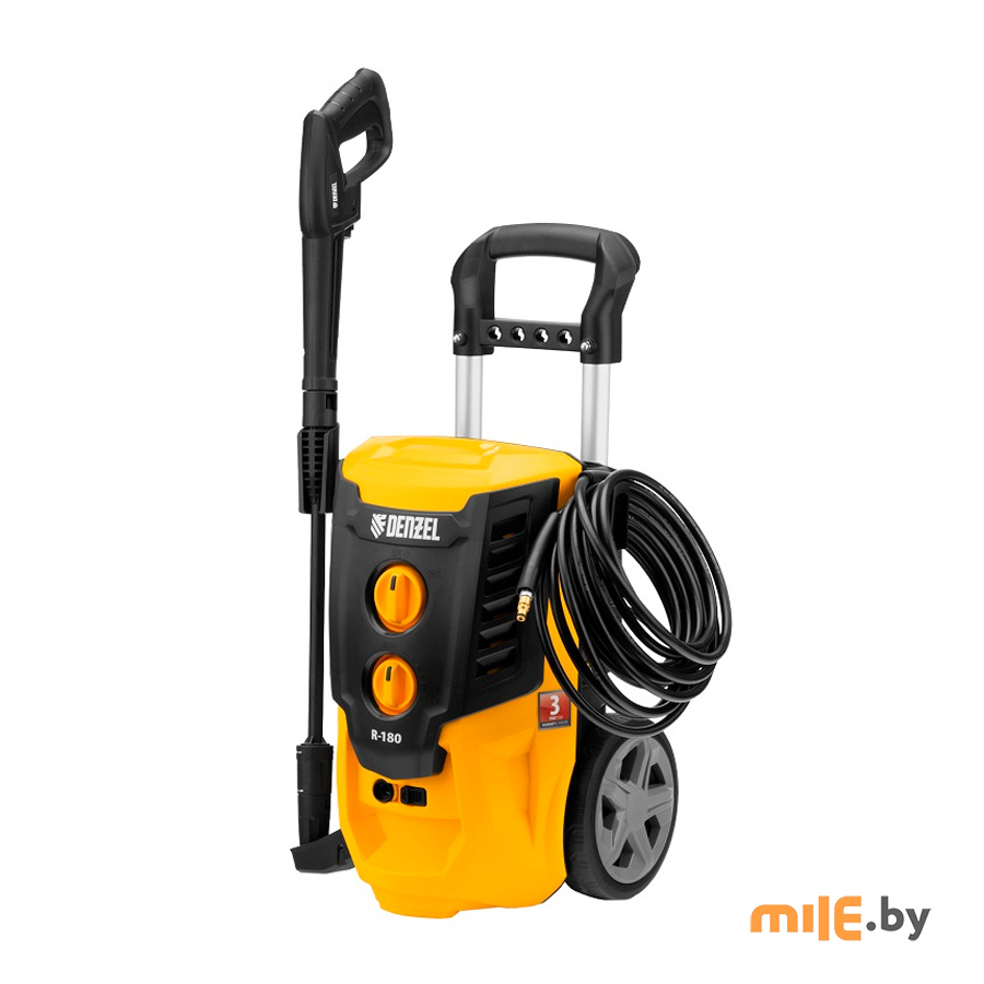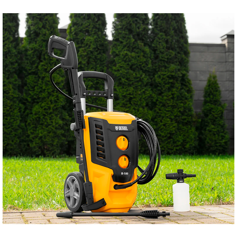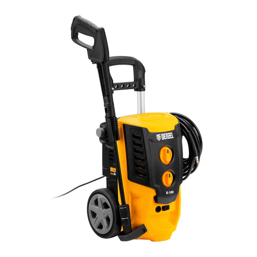 Колесная моечная машина высокого давления Denzel R-180 мощностью 2200 Вт и производительностью 380 л/ч подает струю воды под давлением 180 бар и служит для очищения поверхностей. Позволяет быстро привести в порядок садовые дорожки, удалить пыль и грязь с фасада здания, автомобиля, велосипеда или мотоцикла, отмыть садовый инвентарь. Моечная машина подключается к водопроводу, а при его отсутствии может забирать воду из любого резервуара, работая в режиме самовсасывания. Устройство пригодится для поддержания порядка на загородном участке.