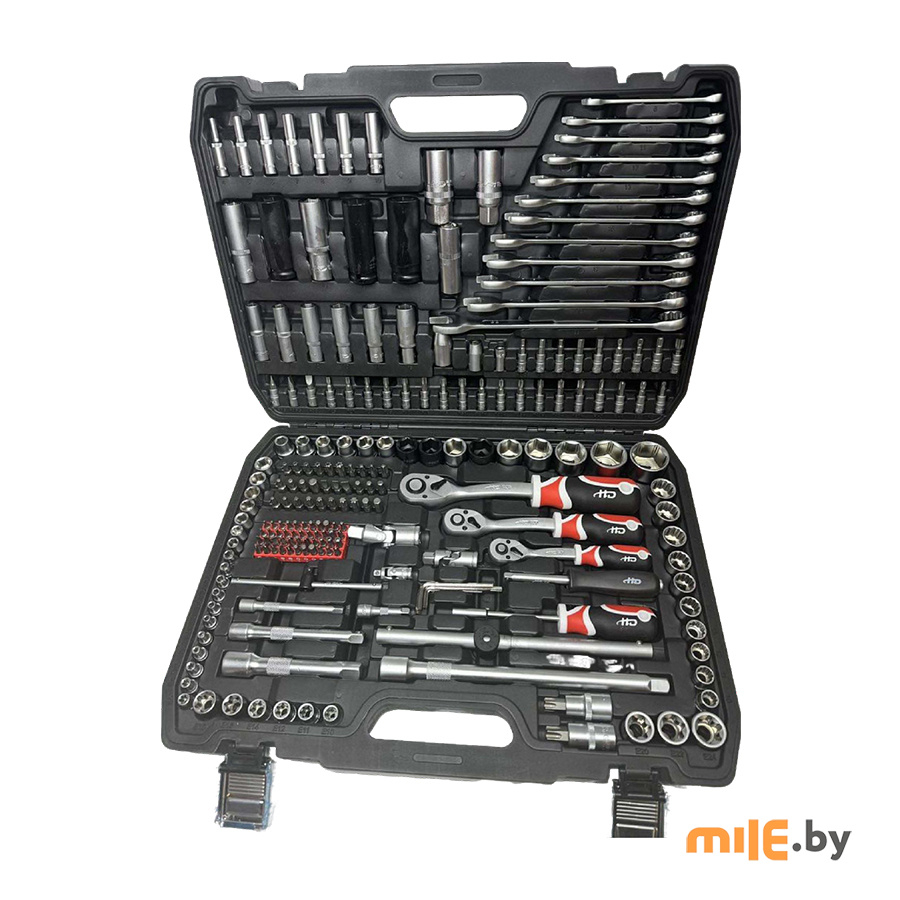 Профессиональный набор инструментов, который был разработан для нужд специализированных авто- и механических сервисов. Торцевые ключи и привод насадки изготовлены из прочной инструментально-ванадиевой стали CRV 50BV3. Насадки изготовлены матричным методом, а перед процессом закалки прошли калибровку с точными приспособлениями и контрольными приборами. В комплект также входят биты из твердой стали S2. Набор позволяет выполнять работы, требующие очень высоких нагрузок и точности, позволяет выполнять множество сервисных работ, связанных с откручиванием и закручиванием резьбовых соединений различных номинальных размеров. Трещотки имеют треугольную рукоятку и 72 зуба (рабочий ход 5 градусов).