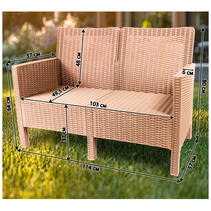 Диван двухместный под искусственный ротанг для вашего сада, террасы, лоджии или дачи. Диван выполнен из высококачественного пластика, устойчивого к ультрафиолету и перепадам температур, что гарантирует долговечность даже в суровых погодных условиях. Выдерживает нагрузку до 240 кг. Разборная конструкция крепления "паз-в-паз".