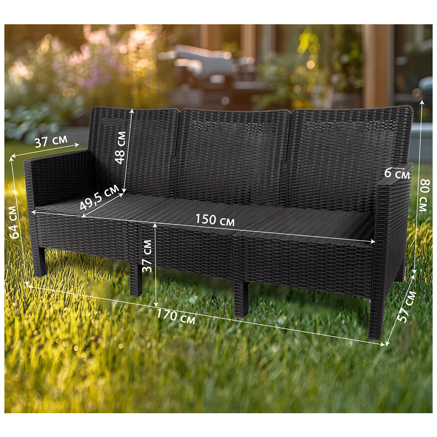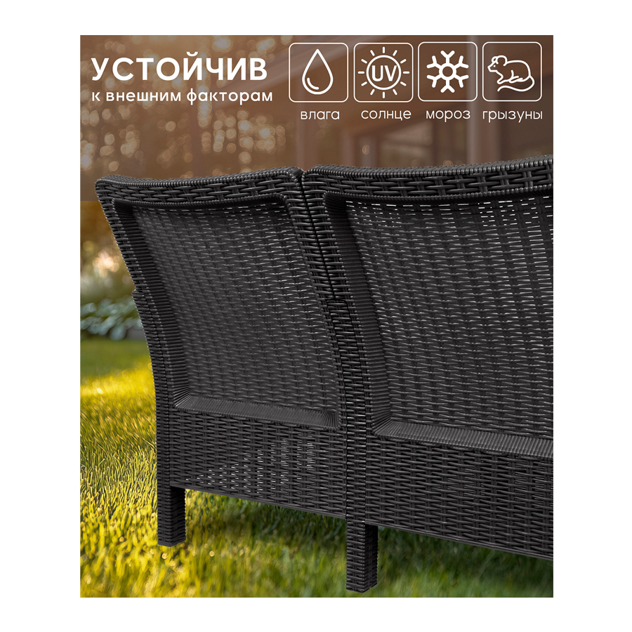 Диван трехместный под искусственный ротанг для вашего сада, террасы, лоджии или дачи. Диван выполнен из высококачественного пластика, устойчивого к ультрафиолету и перепадам температур, что гарантирует долговечность даже в суровых погодных условиях. Выдерживает нагрузку до 360 кг.