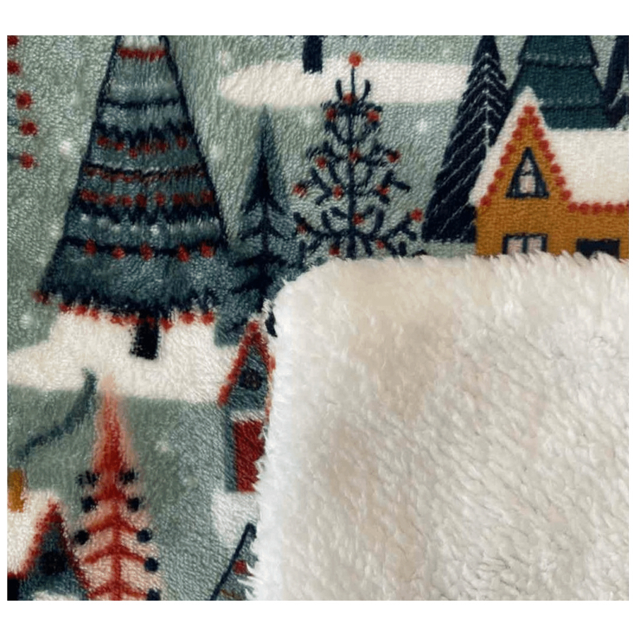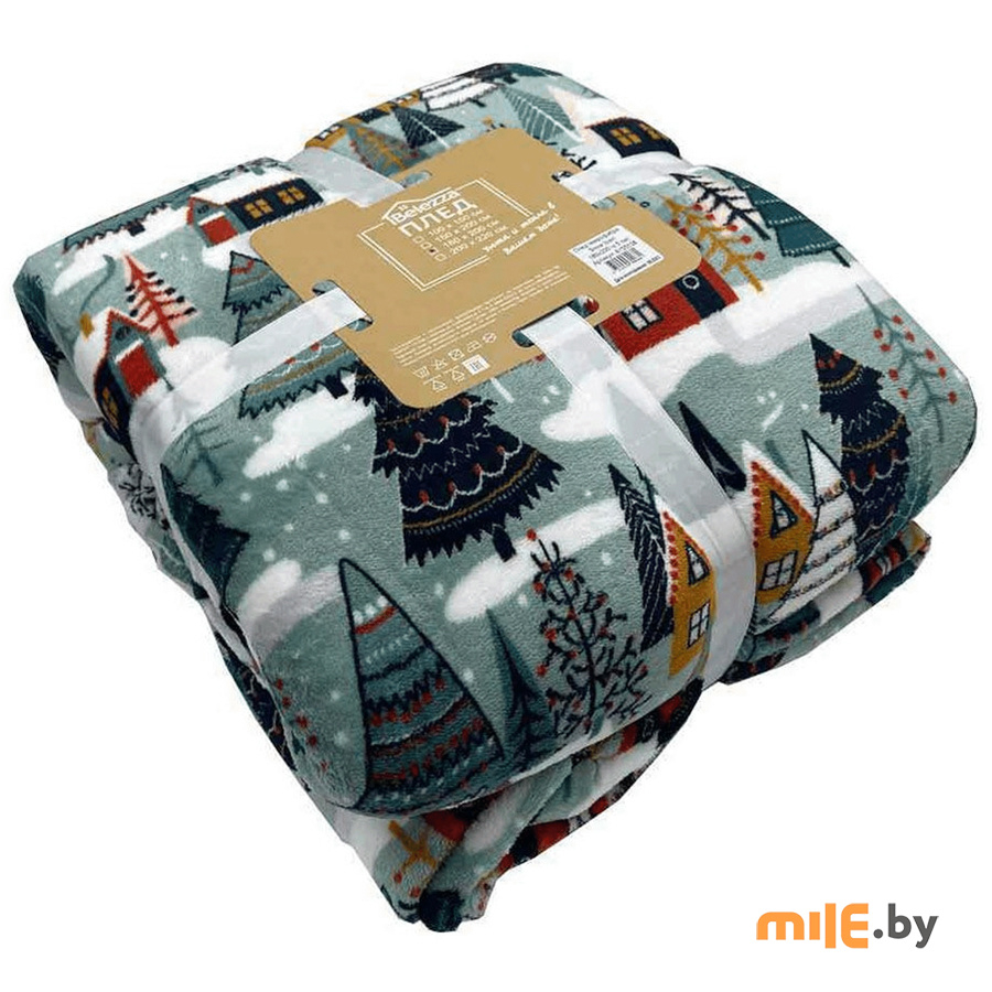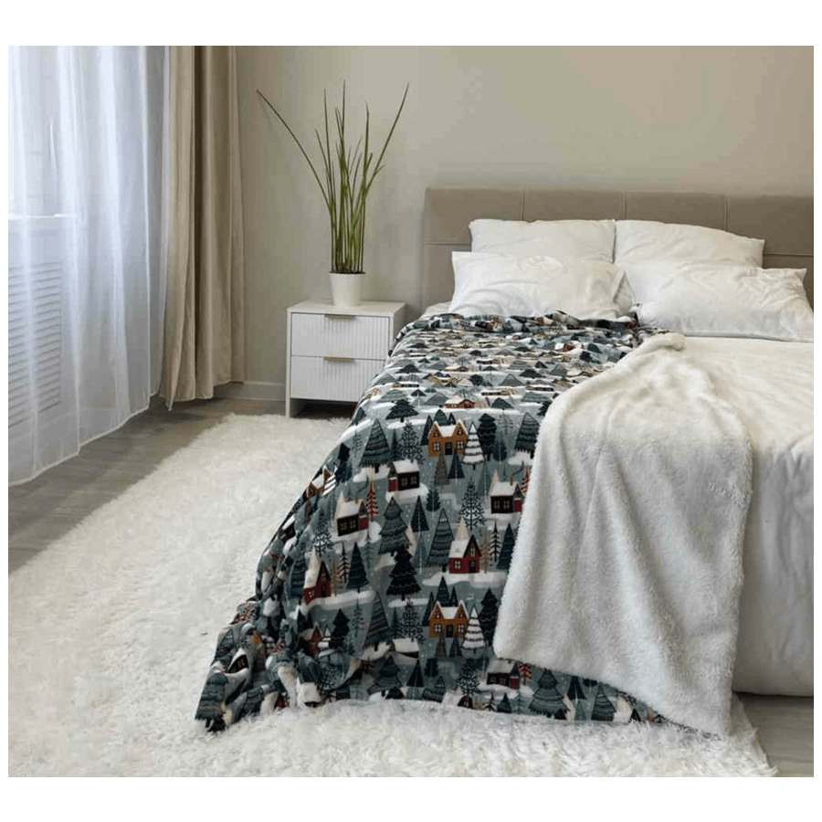 Спокойный новогодний рисунок домиков и елочек на приглушенном фоне отлично подойдет как для создания легкого новогоднего настроения в собственном доме, так и в качестве универсального новогоднего подарка. Такой плед очень теплый за счет второго слоя с шерпой. Сложен книжкой, перетянут атласной лентой под крафтовую этикетку.