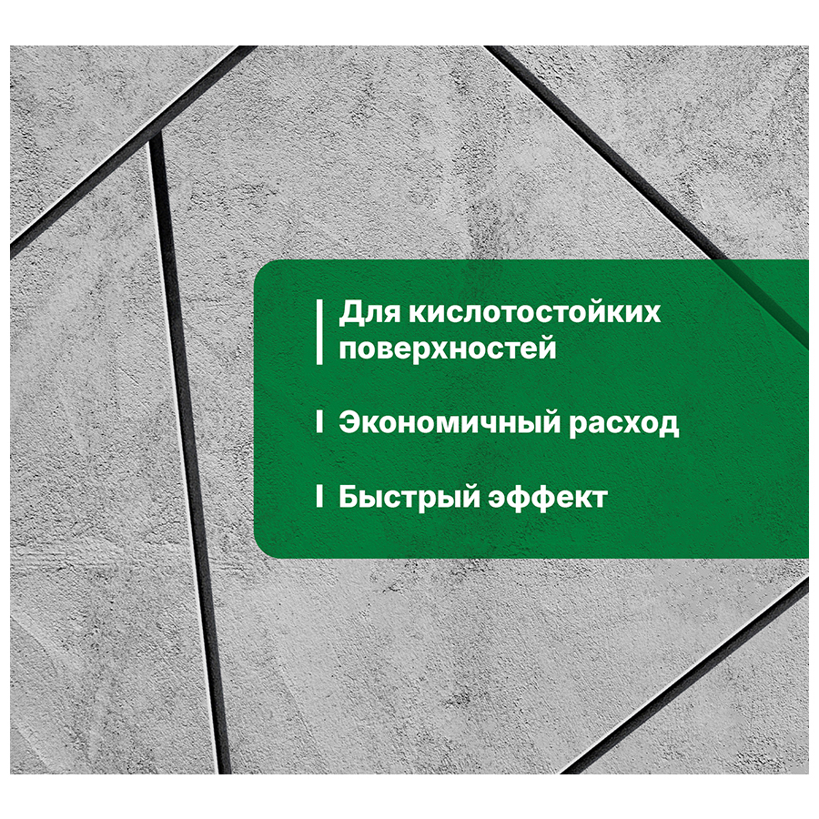 ВНИМАНИЕ! Не применять на бетоне, металле, поверхностях и плитке, неустойчивых к действию кислоты, а также на натуральном и искусственном камне с содержанием извести.