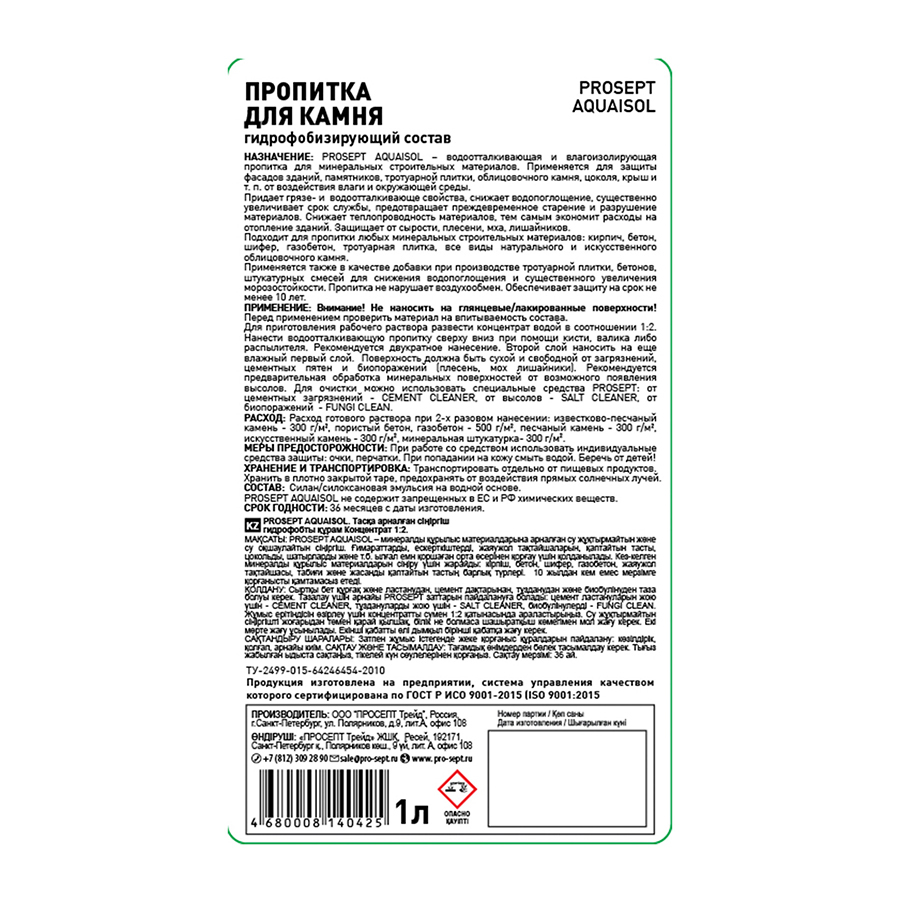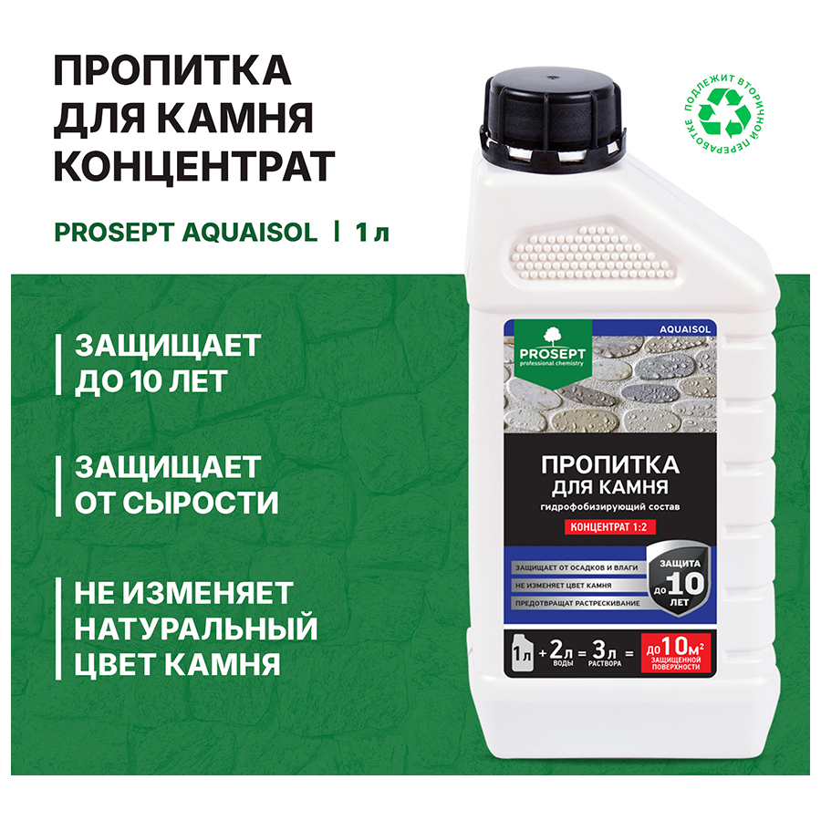 Механизм действия: PROSEPT AQUAISOL — это современная, высокоэффективная, нетоксичная для людей и животных многокомпонентная система силан/силоксанов на водной основе.