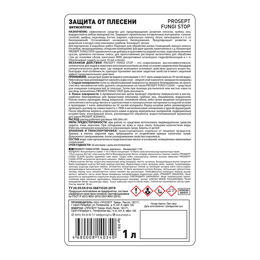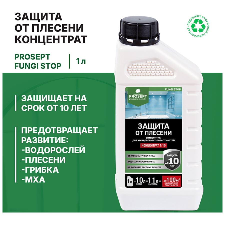 Механизм действия: PROSEPT FUNGI STOP – это современная, высокоэффективная, нетоксичная для людей и животных многокомпонентная система на основе современных биоцидов синергетического действия, где каждый компонент усиливает действие другого вещества. Благодаря этой особенности, препарат проявляет высокие защитные свойства и имеет защитный эффект продолжительного действия.