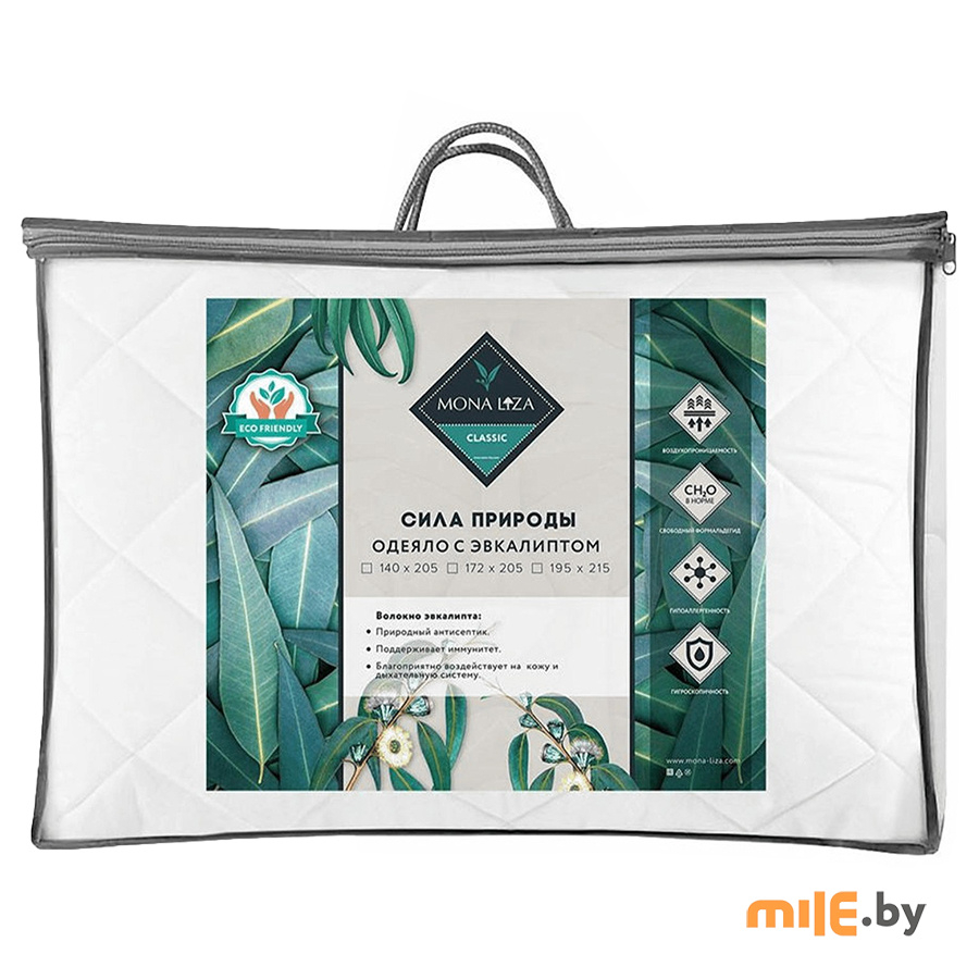 Одеяло полутороспальное Mona Liza Эвкалипт 529437 (140x205 см). Состав верха: тик ПЭ 100%. Состав наполнителя: ПЭ 70%, вискозное волокно с содержанием эвкалипта 30%.