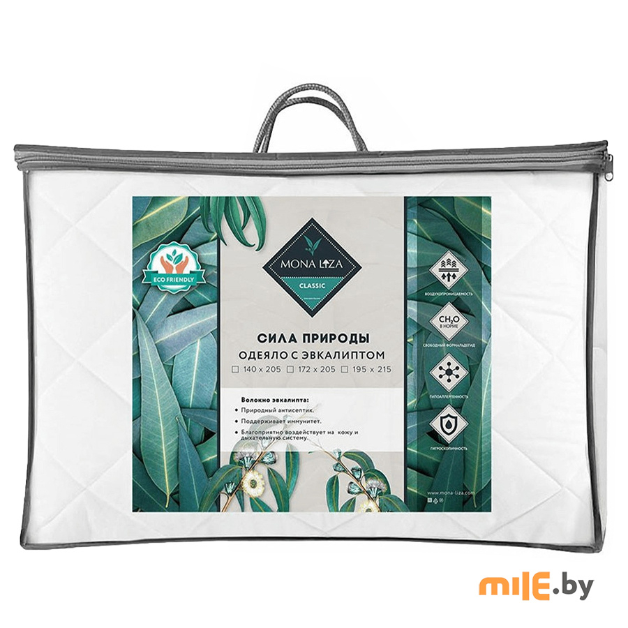 Одеяло двуспальное Mona Liza Эвкалипт 529438 (172x205 см). Состав верха: тик ПЭ 100%. Состав наполнителя: ПЭ 70%, вискозное волокно с содержанием эвкалипта 30%.