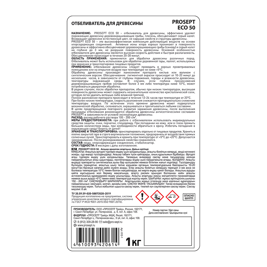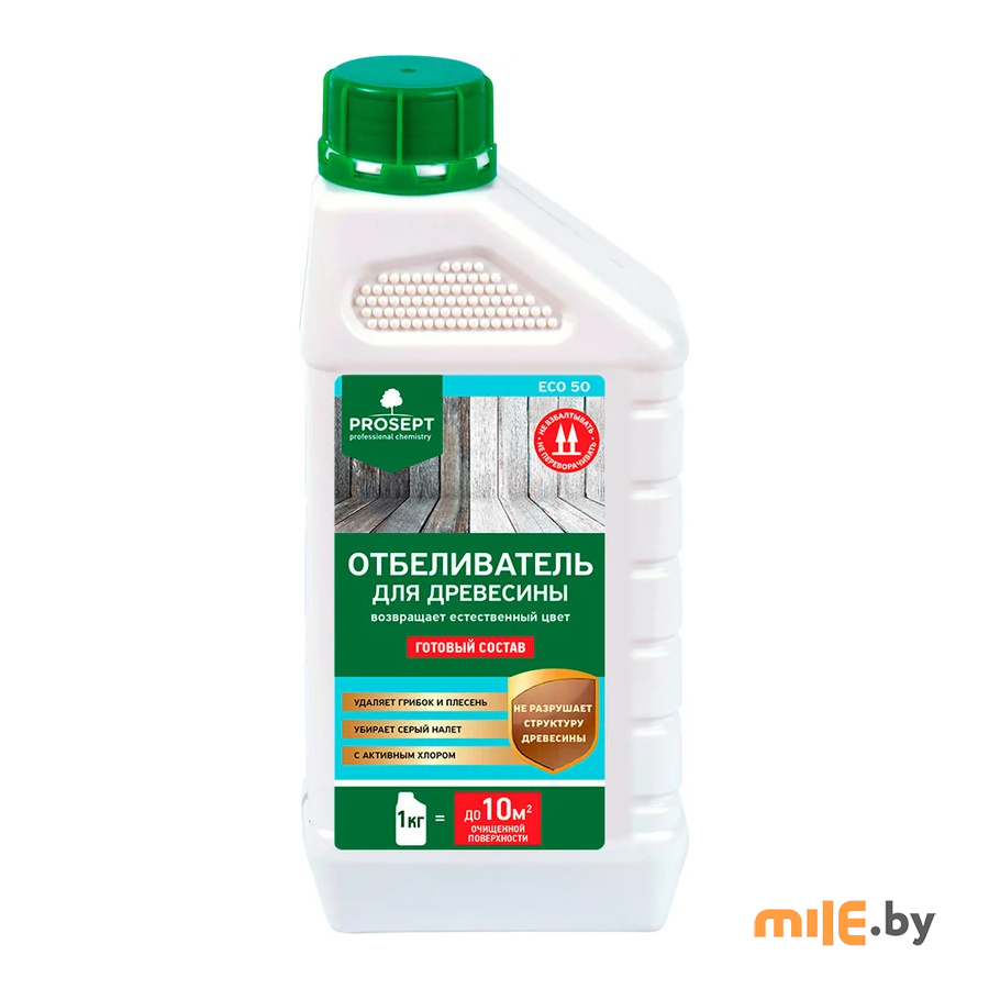 PROSEPT 50 – концентрат, предназначенный для отбеливания древесины. Эффективно удаляет поражающие древесину деревоокрашивающие грибы, плесень, обесцвечивает серый налет. Возвращает древесине естественный цвет, не нарушая естественных свойств и структуры древесины. Применяется для обработки древесины различных пород. Отбеливатель PROSEPT 50 может быть использован для обработки деревянной тары, паллет, используемых при хранении и транспортировке пищевых продуктов. Механизм действия: PROSEPT 50 – это высокоэффективная композиция действующих веществ на основе хлорсодержащих соединений. Активные ионы хлора хорошо проникают в поверхность древесины и эффективно обесцвечивают деревоокрашивающие грибы (синеву) и серый налет на глубине до 3 мм, не разрушая ее. Основной особенностью отбеливателя для древесины PROSEPT 50 является высокая скорость действия и быстрая разлагаемость. Обесцвечивание происходит в течение 20-30 минут. Полное разложение препарата происходит в течение 12-24 часов при температуре от 20°С. При более низких температурах скорость разложения снижается пропорционально снижению температуры воздуха. По истечении этого времени древесина может подвергаться механической обработке, склеиваться, окрашиваться и пропитываться любыми составами. Способ применения: Для обработки древесины необходимо развести препарат водой в соотношении 1:1. Для разведения рекомендуется использовать емкости из стали с резиновой футеровкой, полипропилена, полиэфира, стекла. В зависимости от интенсивности поражения и температуры окружающей среды можно использовать как 50% водный раствор препарата, так и концентрат. Обработку древесины производят нанесением препарата кистью или валиком с синтетическим ворсом. Обесцвечивание пигментной окраски происходит от 20 минут до нескольких часов, в зависимости от глубины поражения, природы древесины и температуры окружающей среды. В случаях, если глубина проникновения деревоокрашивающих грибов составляет более 3 мм либо температура воздуха ниже 10°С, может потребоваться двукратная обработка. В редких случаях после обработки препаратом, обычно при низких температурах, высохшая поверхность древесины может содержать незначительное количество кристаллической соли, которую легко удалить ветошью либо влажной тряпкой. В целях предотвращения повторного развития заражения древесины, после выполнения процедуры обработать PROSEPT Universal. Отбеливание древесины следует проводить в хорошо проветриваемых помещениях или на открытом воздухе при температуре не ниже +5°С. Расход: расход рабочего раствора 80-200 г/м2 Меры предосторожности: При работе с отбеливателем использовать индивидуальные средства защиты: очки, перчатки, спецодежду. При попадании на кожу или в глаза промыть большим количеством воды, при необходимости обратиться к врачу. Беречь от детей! Хранение и транспортировка: Транспортировать отдельно от пищевых продуктов. Хранить в плотно закрытой таре в строго вертикальном положении, предохранять от воздействия прямых солнечных лучей. Транспортировать и хранить при температуре от +5°С до +20°С. Состав: водный раствор хлорсодержащего соединения, стабилизатор.