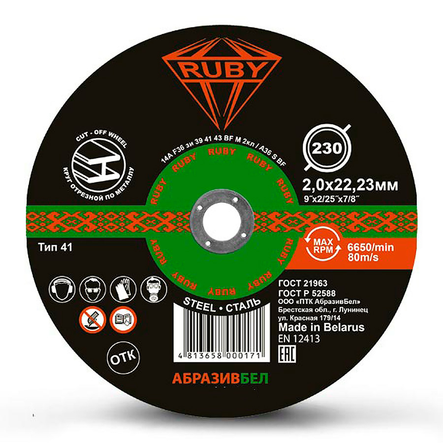 Диск отрезной по металлу цена - Профессиональный абразивный инструмент, произведенный из высококачественного европейского сырья, характеризующийся высокой производительностью, а также первоклассными показателями износостойкости, точности и скорости реза. Максимальная безопасность при проведении работ. Используется на ручных угловых машинах с диаметром шпинделя 22,23 мм. Диаметр круга составляет 125 мм., а высота (h) 2.0 мм. Данный круг состоит из смесей электрокорунда нормального (14А) зернистостью 36. Основу бакелитовой связки составляет фенолформальдегидная смола порошкообразная (СФП) и жидкая(БЖ).Также в смеси используются неорганические наполнители, такие как криолит, пирит. Круг армируется специальной бакелитовой стеклосеткой плотностью 180. Благодаря использованию армирующей стеклосетки линейная скорость достигает 80 м/с и более, что повышает эффективность реза.