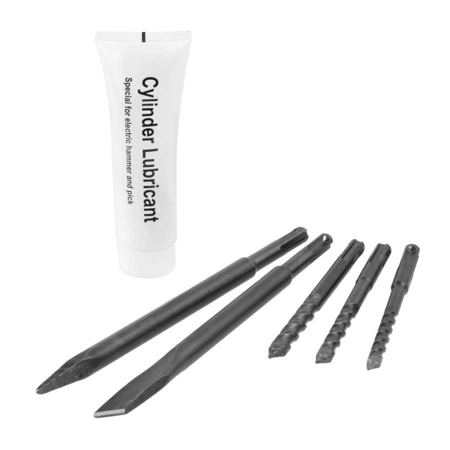 Перфоратор поставляется в надежном пластиковом кейсе вместе с 3 сверлами и 2 зубилами (зубило плоское - 1 шт., зубило пиковое - 1 шт.),дополнительной рукояткой и смазкой (1 уп.).