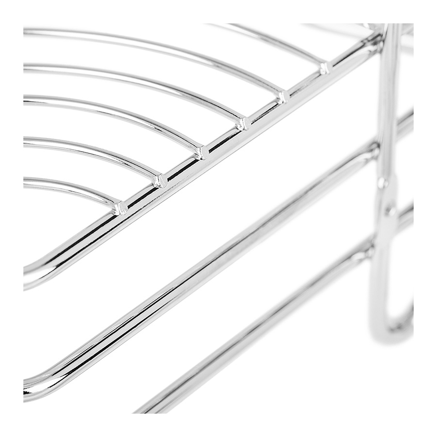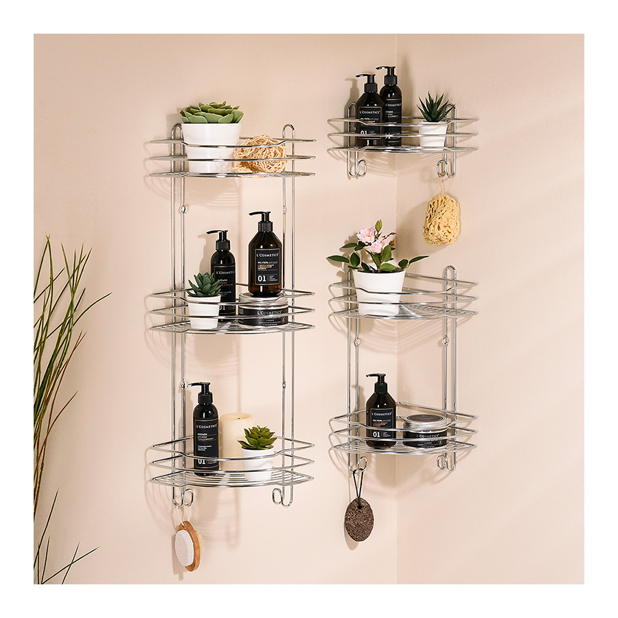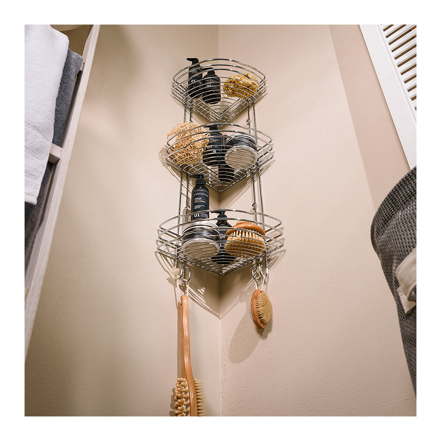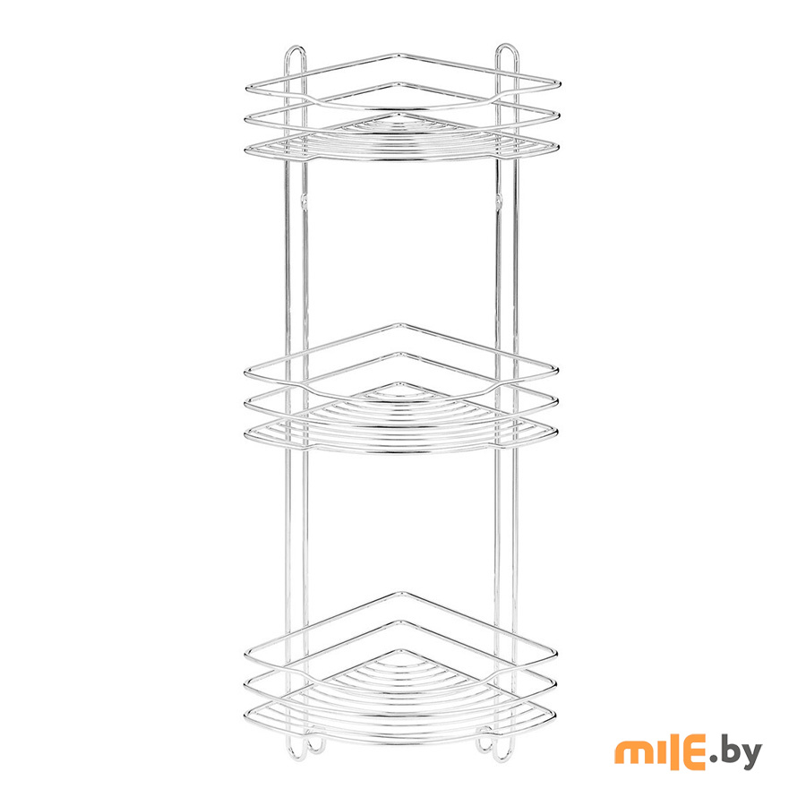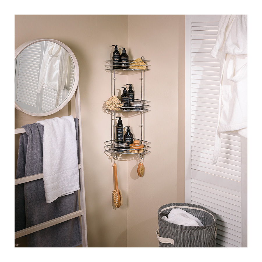 Трёхъярусная угловая полка с крючками из стали с гальваническим покрытием цвета хром. Размеры изделия: высота 72 см, длина 22,2 см, ширина 22,2 см. Отлично подойдет для хранения банных принадлежностей, таких, как мочалки, флаконы, мыло и др. Надёжный крепёж и толстый пруток (2,5 и 5 мм) выдерживает большую нагрузку. Гальваническое покрытие обеспечивает повышенную стойкость к коррозии, благодаря чему полка прослужит долго. Покрытие обладает повышенной стойкостью к щелочам, входящим в состав косметических средств и бытовой химии. Изделие долго сохраняет первозданный вид. Аккуратно обработанные края и швы облегчают уход. Увеличенный промежуток между ярусами в 28,3 см и вместительные полки позволяют разместить высокие бутылочки и предметы, как крупного, так и мелкого размера. Высокий бортик препятствует выпадению содержимого. Дно из проволоки не удерживает жидкость. Полка также оснащена двумя крючками, которые можно использовать для полотенец и мочалок. Универсальный цвет. Такой аксессуар позволит не только украсить ванную комнату, но и эргономично использовать доступное пространство.