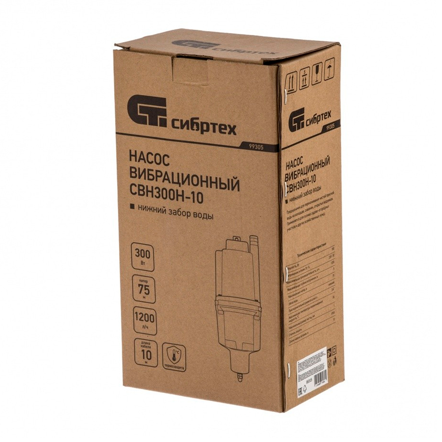 Вибрационный насос Сибртех СВН300Н-10 99305 с кабелем 10 м и нижним забором жидкости имеет мощность 300 Вт и производительностью до 1200 л/ч, обеспечивает напор до 75 м и предназначен для перекачивания чистой воды из колодцев и скважин диаметром от 10 см на глубине погружения до 5 м. Также может осуществлять забор воды из водоемов, резервуаров, затопленных помещений. Его используют в системах орошения садов и огородов или для организации водоснабжения на даче.