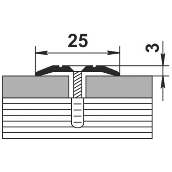 Плоский профиль шириной 25 мм с двумя желобками. Закрывает стык двух одноуровневых поверхностей. Открытый крепеж.