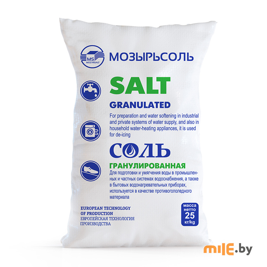 Гранулированная соль Мозырьсоль предназначена для подготовки и умягчения воды в промышленных и частных системах водоснабжения, а также в бытовых водонагревательных приборах. Используется для восстановления рабочих характеристик ионообменных смол водоумягчительных установок. Обладает противогололёдными свойствами. Защищает нагревательные элементы от образования известковых отложений.