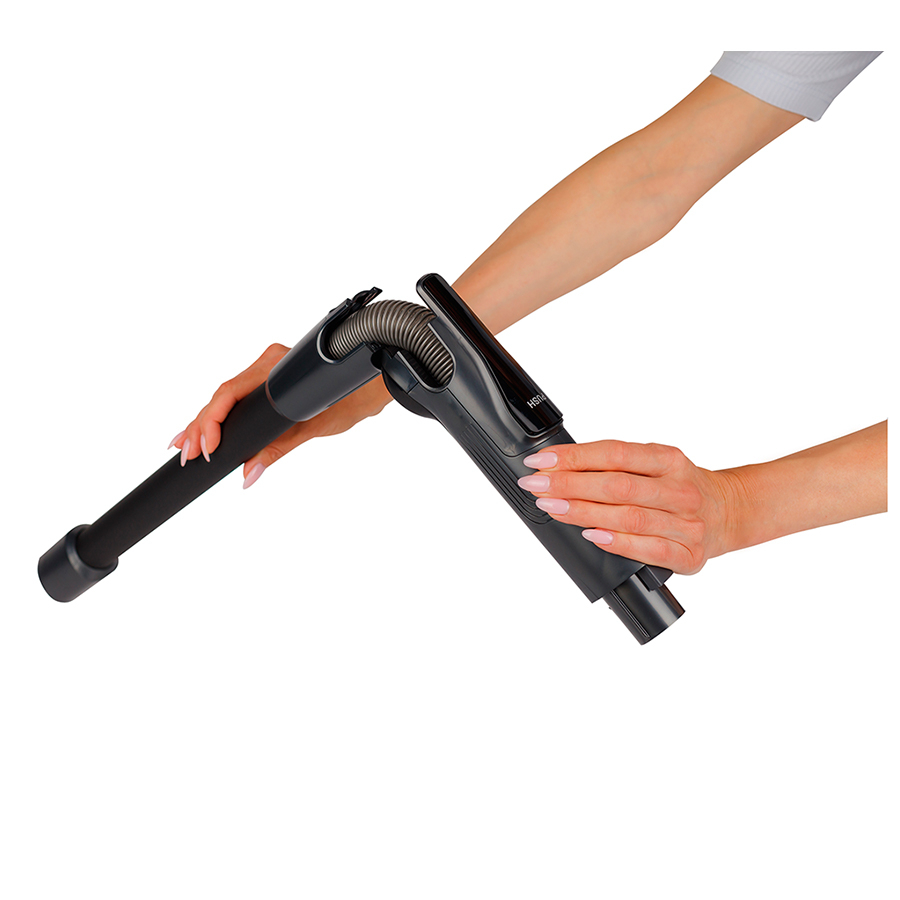 Складная труба одним нажатием руки сгибается под углом 90°, чтобы можно было, не наклоняясь до пола, пропылесосить узкий зазор под мебелью. Если мебель широкая и не удается достать до плинтуса, щетку заменяют на щелевую насадку с телескопическим удлинением.