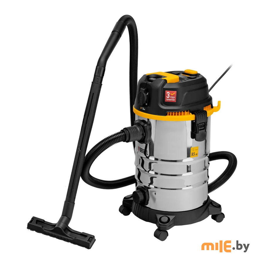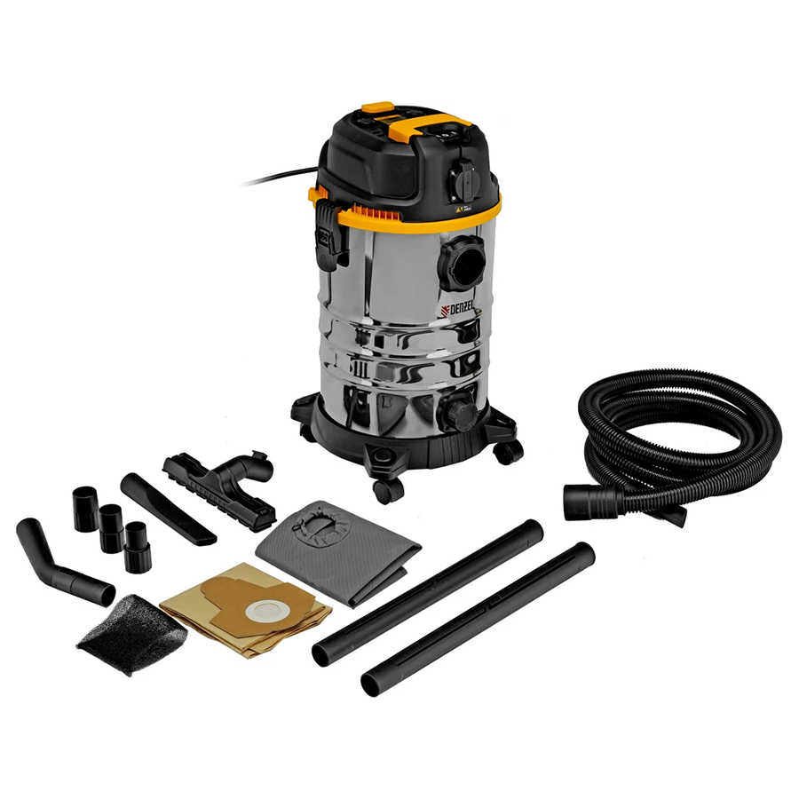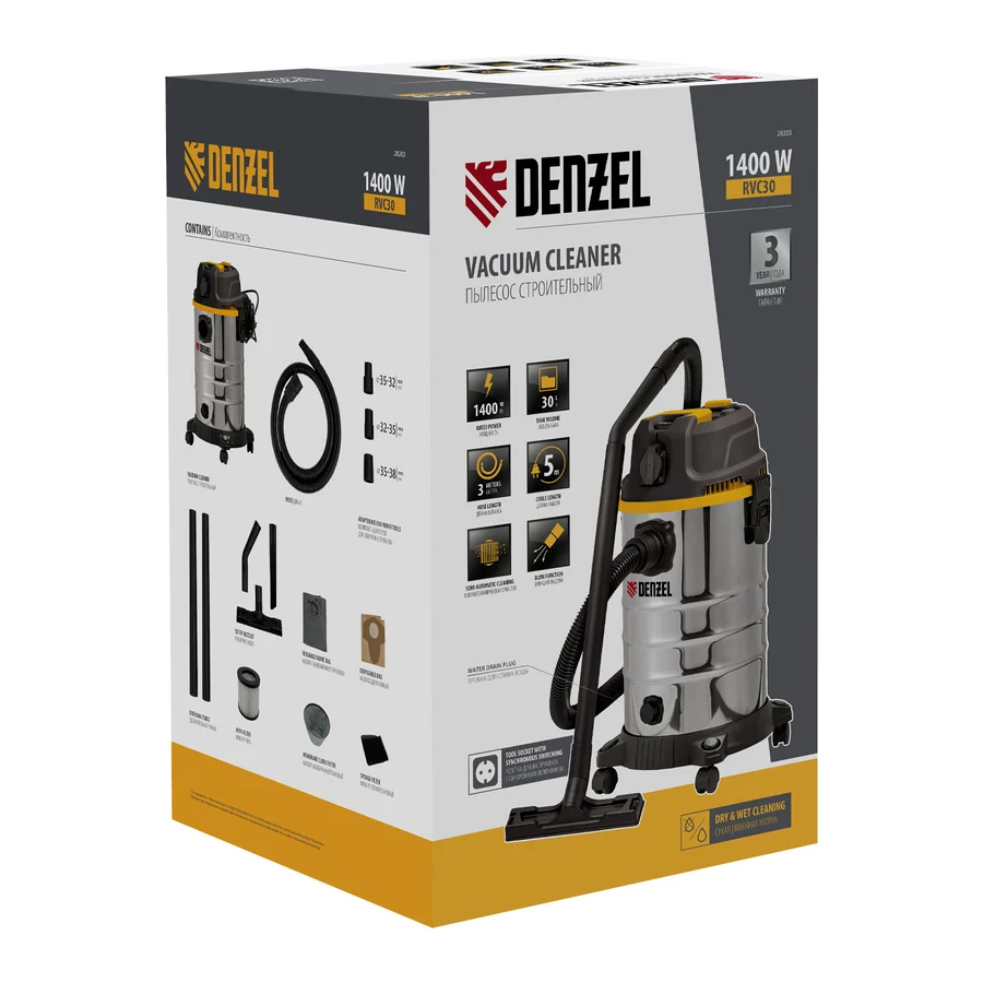 Пылесос строительный Denzel RVC30 28203 мощностью 1400 Вт, с баком объемом 30 л и шлангом длиной 3 м, оснащен розеткой с автосинхронизацией и предназначен для уборки бетонной, кирпичной пыли, опилок, стружки, также предусмотрена функция сбора воды. К пылесосу можно подключить электроинструмент, чтобы минимизировать количество пыли, образующейся в результате пиления, сверления, фрезерования. Техника используется во время проведения строительных и ремонтных работ, будет полезна для поддержания чистоты в мастерской, гараже, производственном помещении.