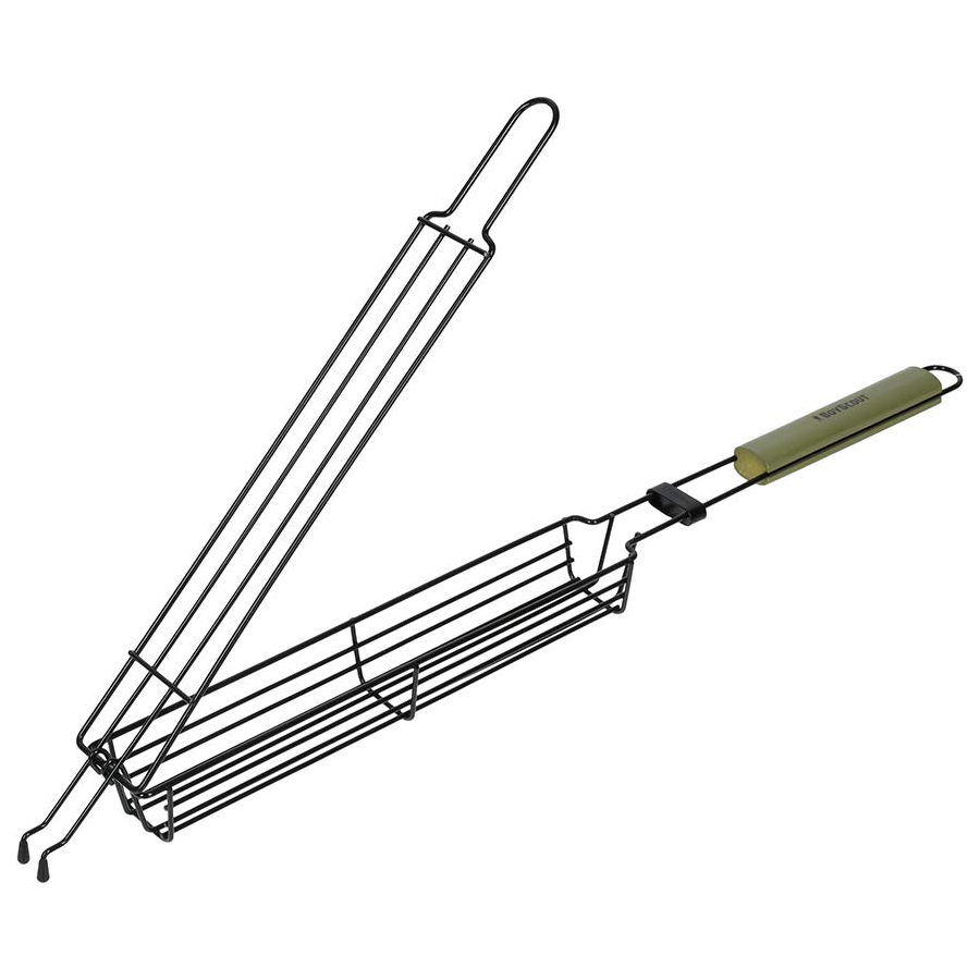 Размер с ручкой: 49(+5)x 26 х 4 х 3 см. Жарочная поверхность: 26 х 4 х 3 см. Выполнена из высококачественной стали с антипригарным покрытием, дополнена деревянной ручкой с фиксирующим кольцом для надежной фиксации верхней створки. Усики-фиксаторы позволяют устойчиво закрепить решетку на мангале.